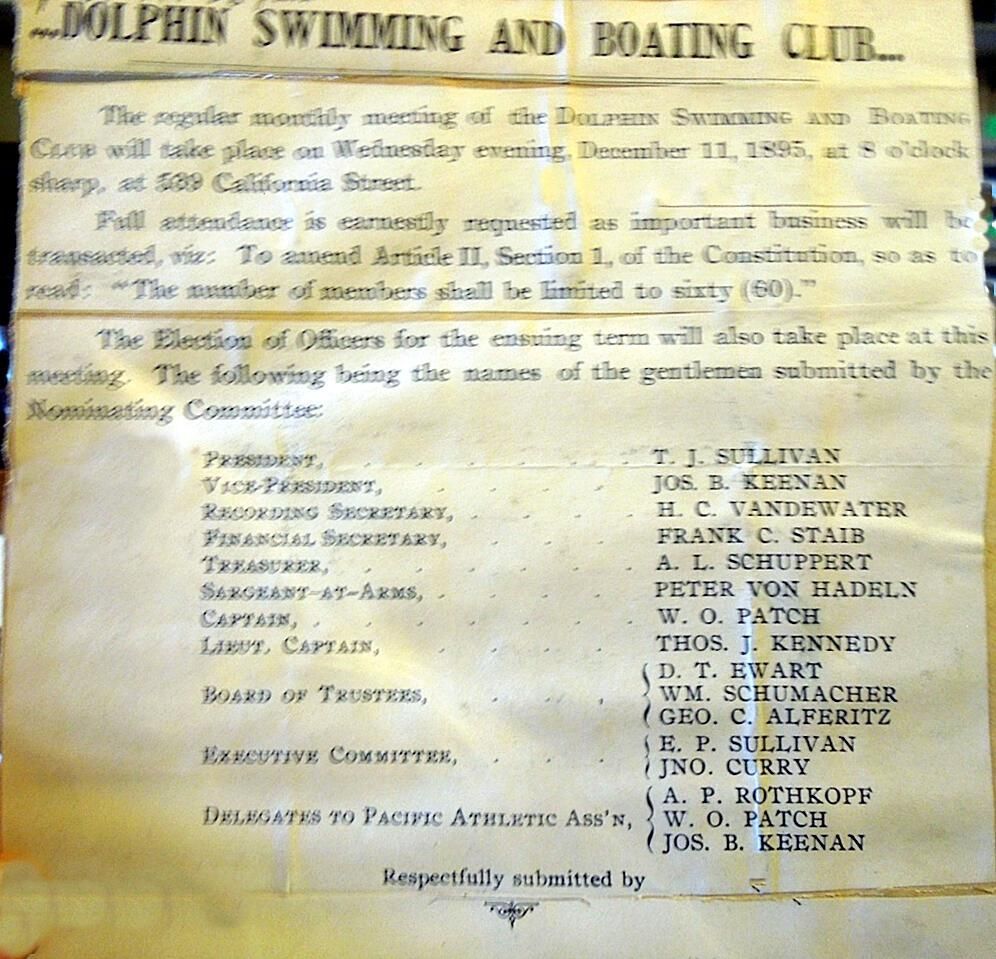 Copy of announcement for December 11, 1895 meeting to elect officers for coming year, at venue 539 California St. Includes names of officers.