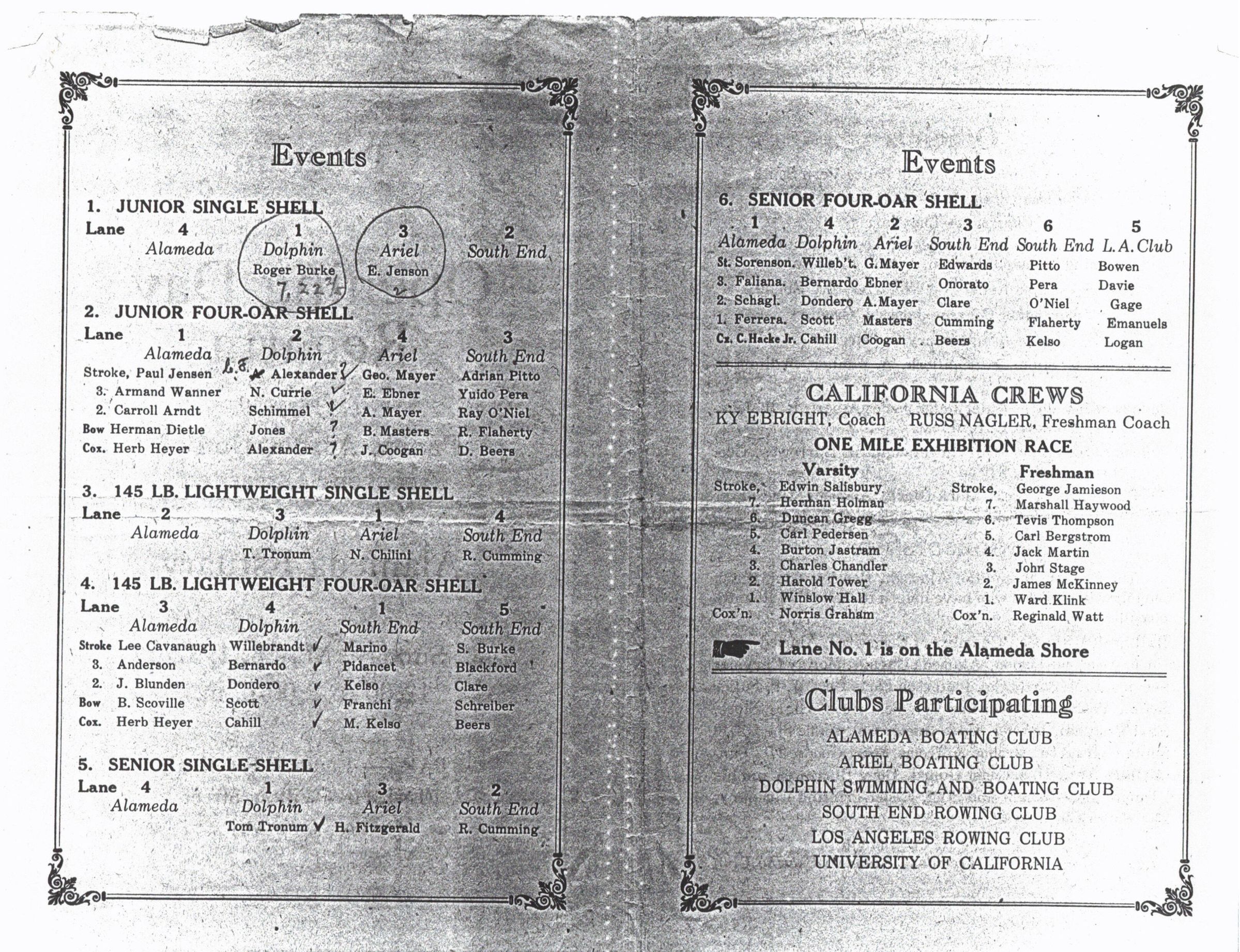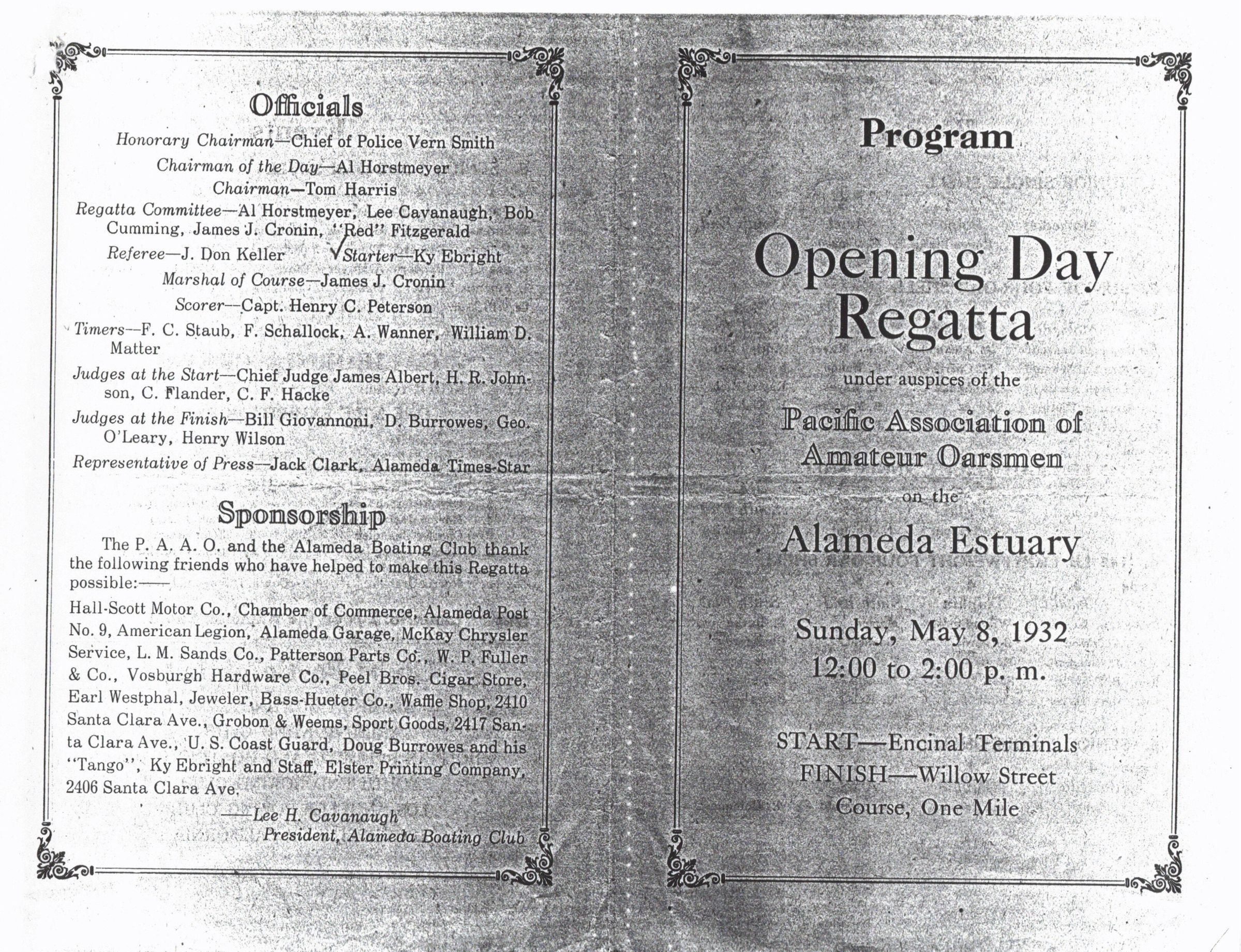 Photocopy of program for Opening Day Regatta of the Pacific Association of Amateur Oarsmen on the Alameda Estuary. Folds to 4 half-size pages. Pages 2-3 detail 6 rowing events, with names of rowers and participating clubs.