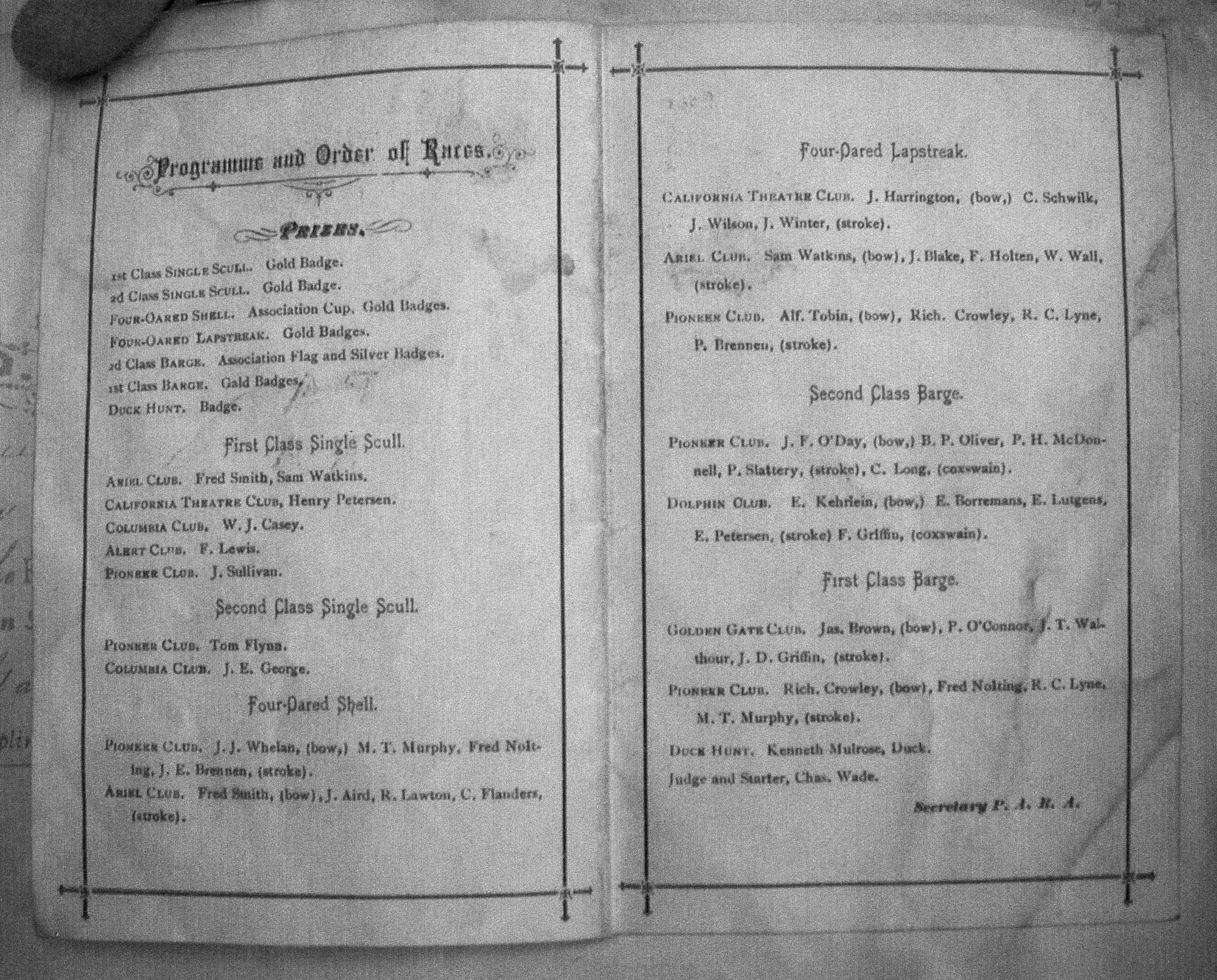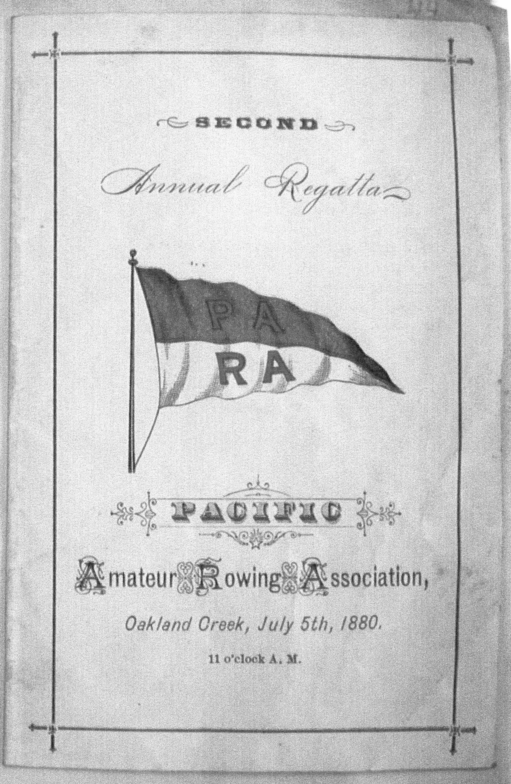 Copy of program for Second Annual Regatta of Pacific Amateur Rowing Association. Held July 5, 1880 at Oakland Creek.