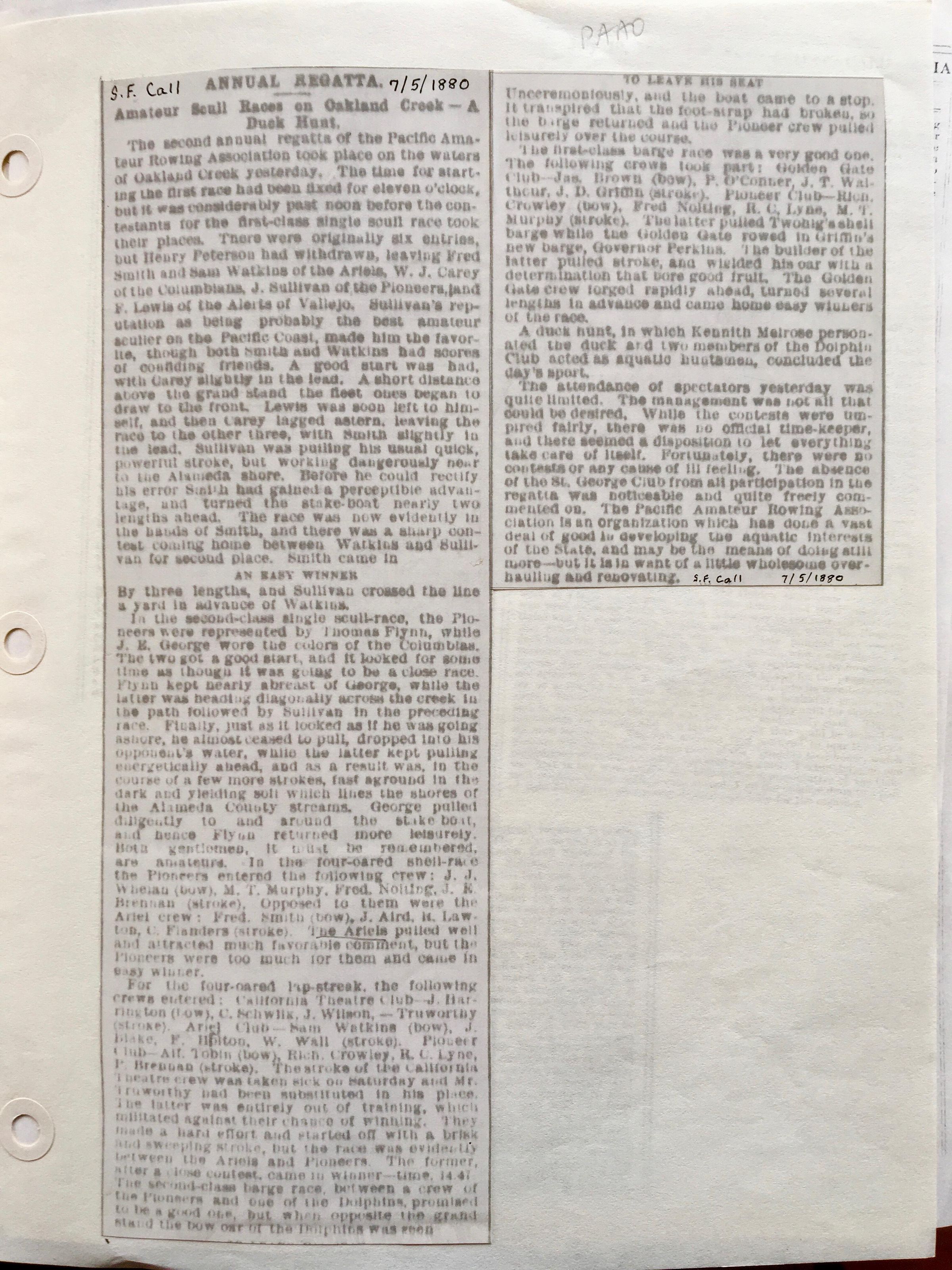 Article from SF Call on regatta is in 1880 Year file.