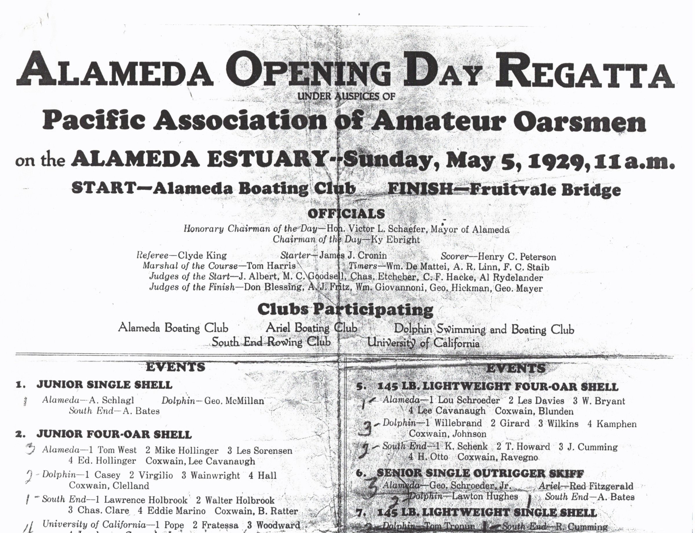 Overlapping 2 page copy of schedule of Alameda Opening Day Regatta, held under the auspices of the Pacific Association of Amateur Oarsmen PAAO on the Alameda Estuary. Lists of officials, participating clubs, events, and rowers, with handwritten notes indicating rowers' place in race.Archive Details