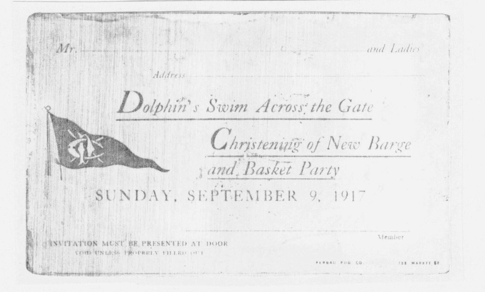 Copy of ticket for activities on September 9, 1917: "Dolphin's Swim Across the Gate, Christening of New Barge, and Basket Party."Archive Details