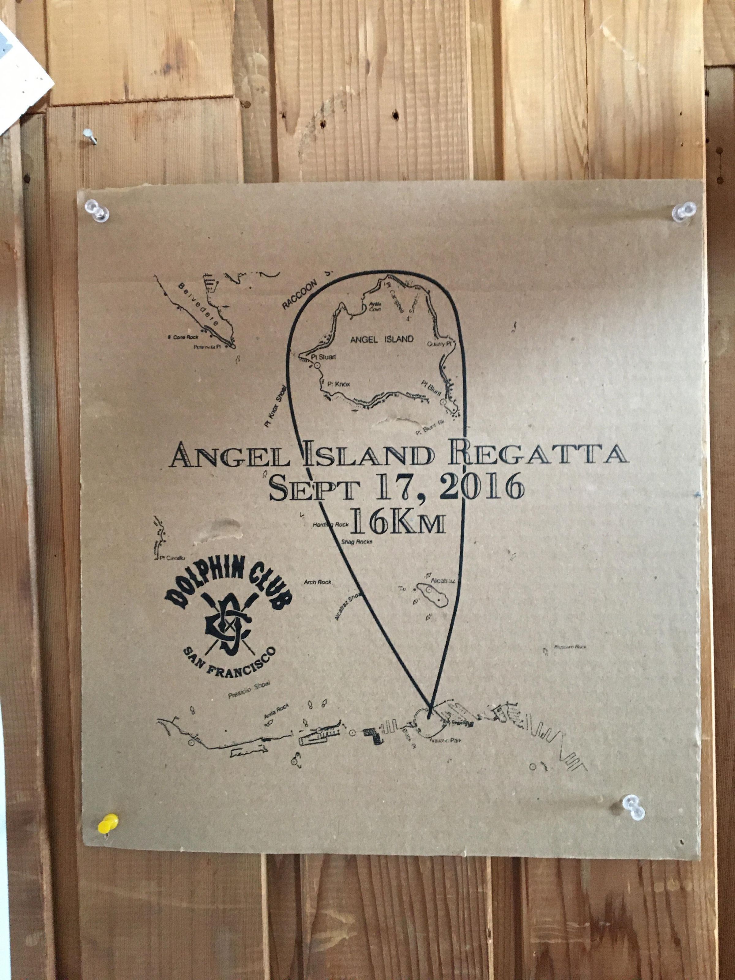 Paper chart of route of rowing race from Dolphin Club out around Angel Island and back on September 17, 2016. Attached to wall with clear push pins.Made/Created