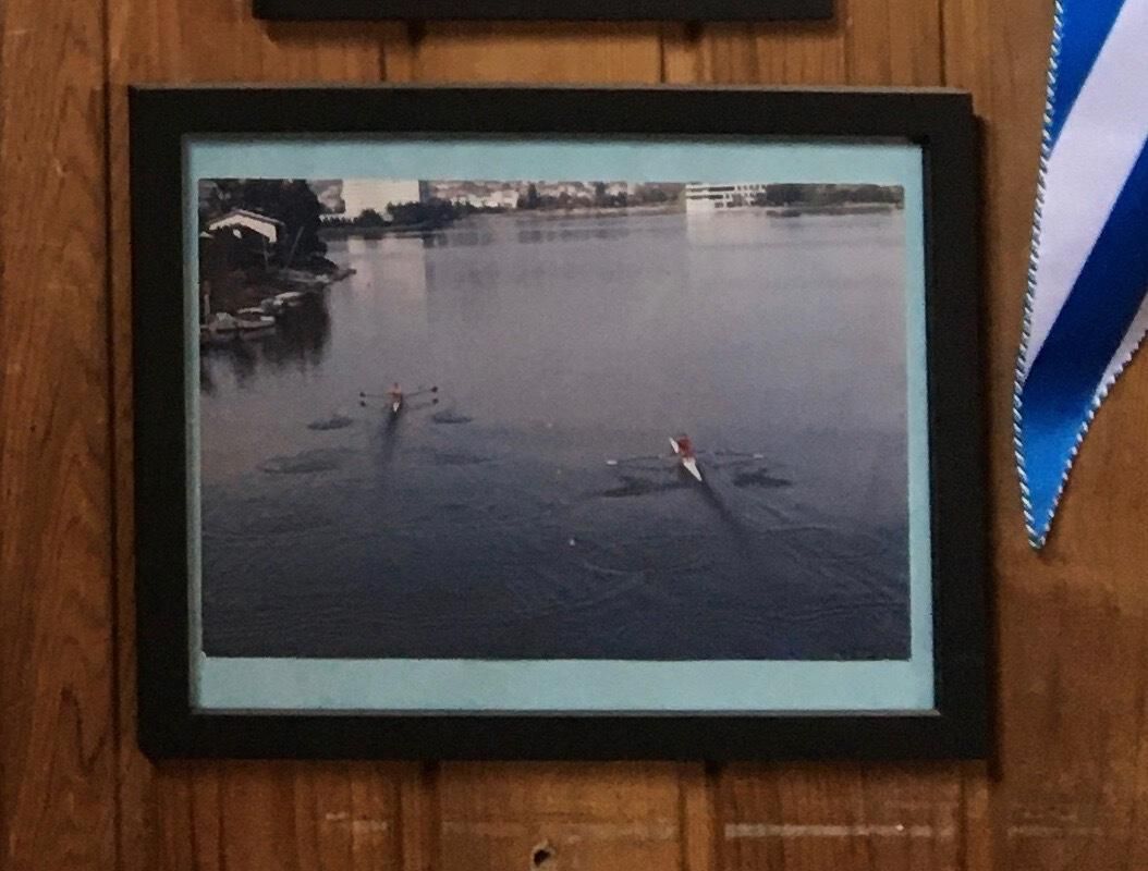 Color photo of one double and one single, probably in a river. Black wood frame, light blue mat, glass.Location
