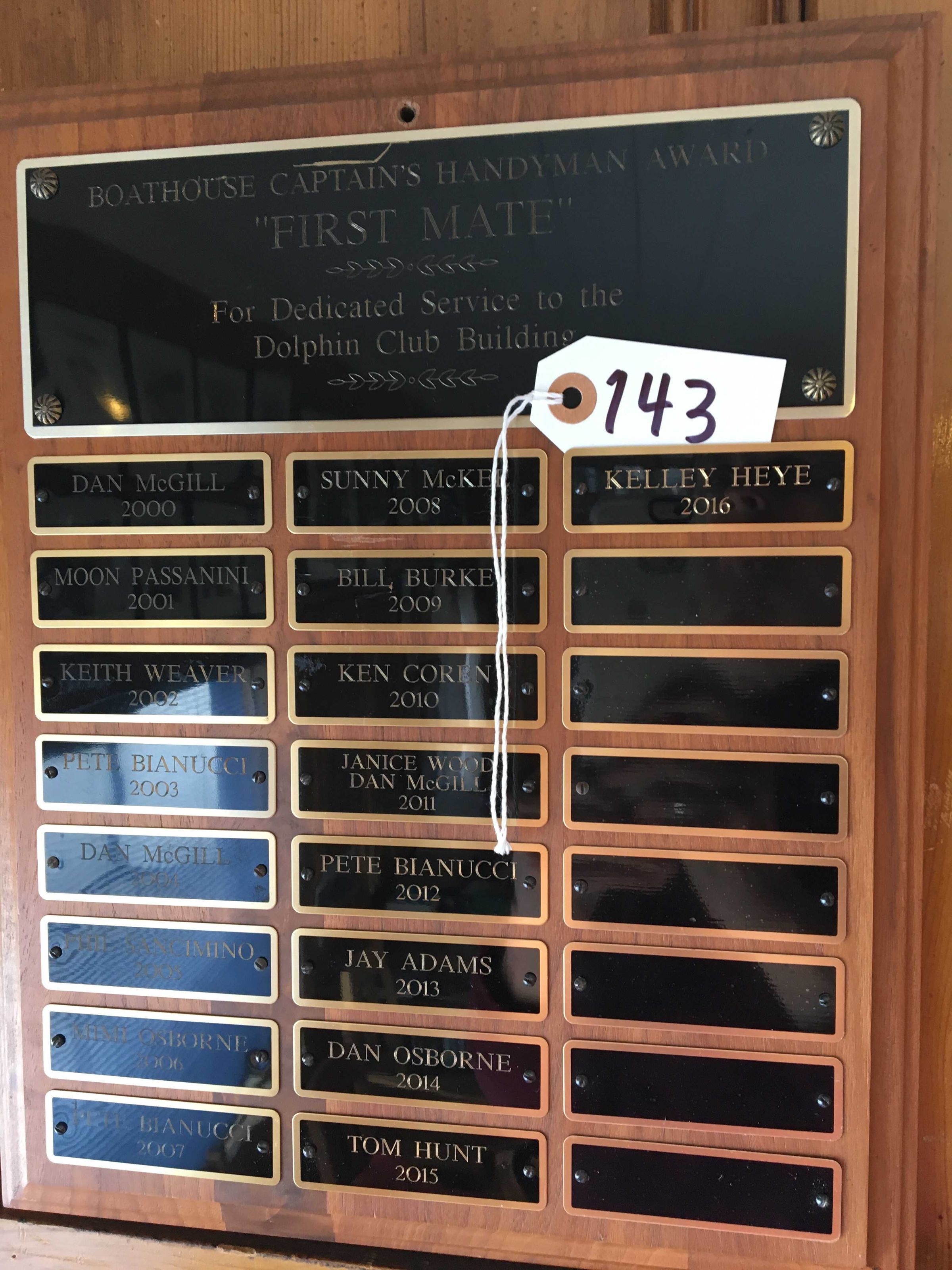 Text on title plate: "Boathouse Captain's Handyman Award - FIRST MATE - For Dedicated Service to the - Dolphin Club Building"
