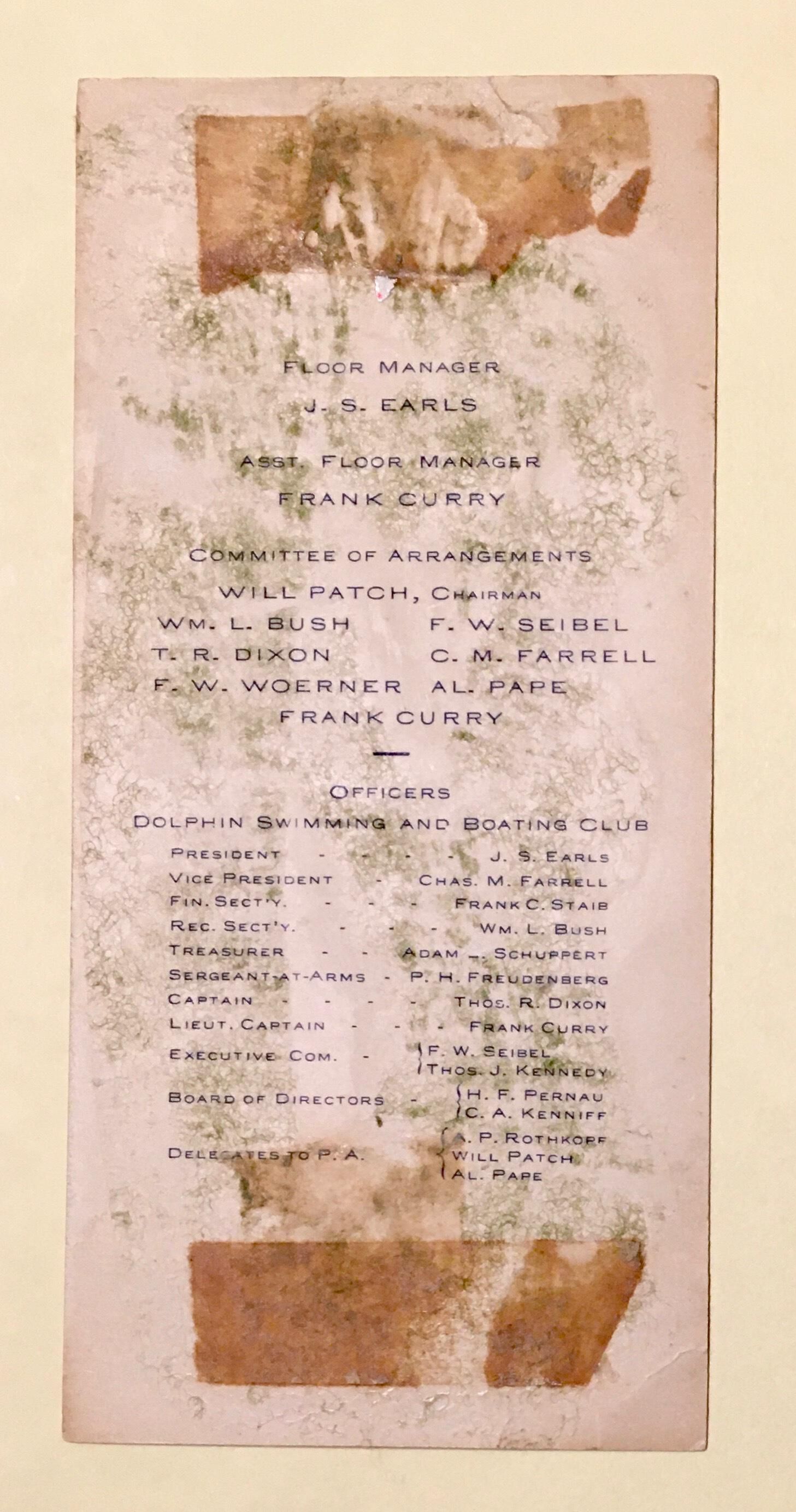 Front of card has embossed crossed US and Dolphin Club flags at top. Back of card lists event organizers and club officers for 1902.Archive Details