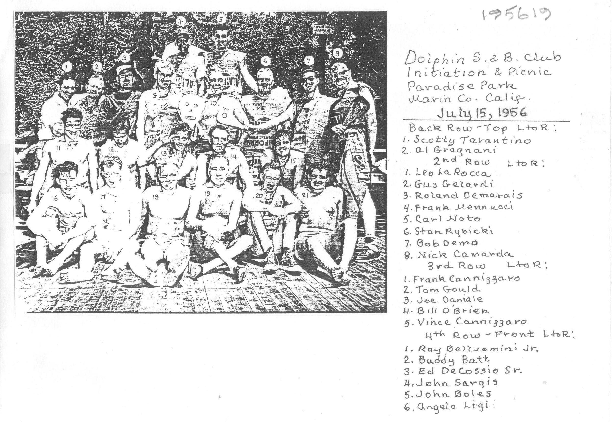See folder "Letter from Italy" in Cooper files. Alternative scan of this photo were donated by Giuseppe "Joe" Daniele who dropped into club in November 2014 with wife and bother. He was living in Italy then, but he had been a club members in the 1950. In December 2014 he sent a number of scans of photos 1956-1957. He is in the photo third row from top, third from left.