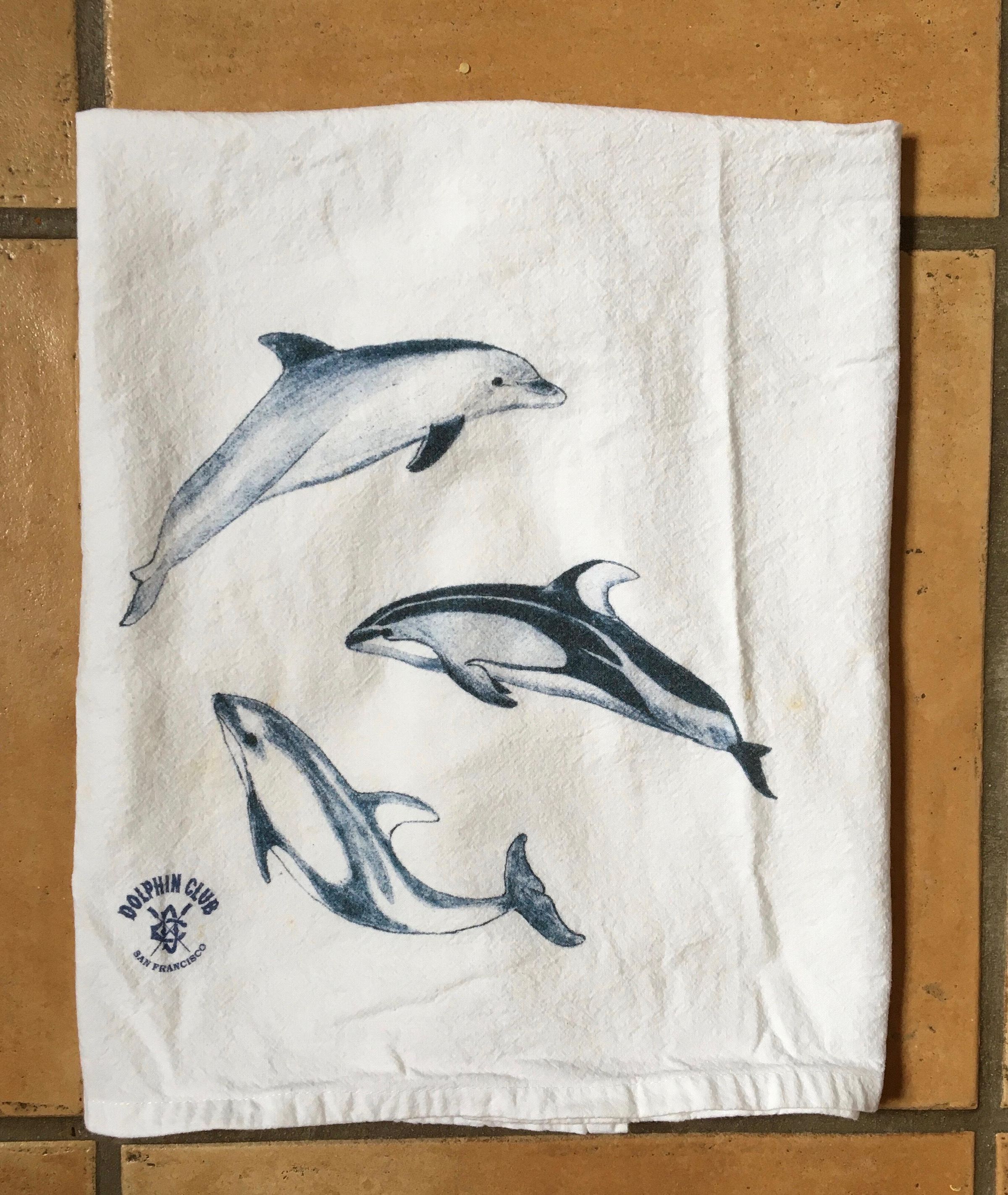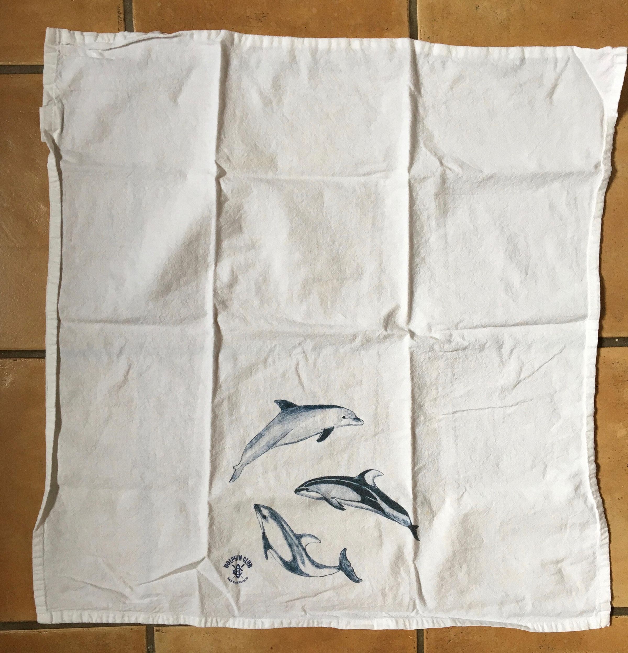 Square natural color cotton flour bag style dish towel. Three dolphins and DC logo printed in blue center bottom. Small strip sewn near label on upper corner on back to hang.