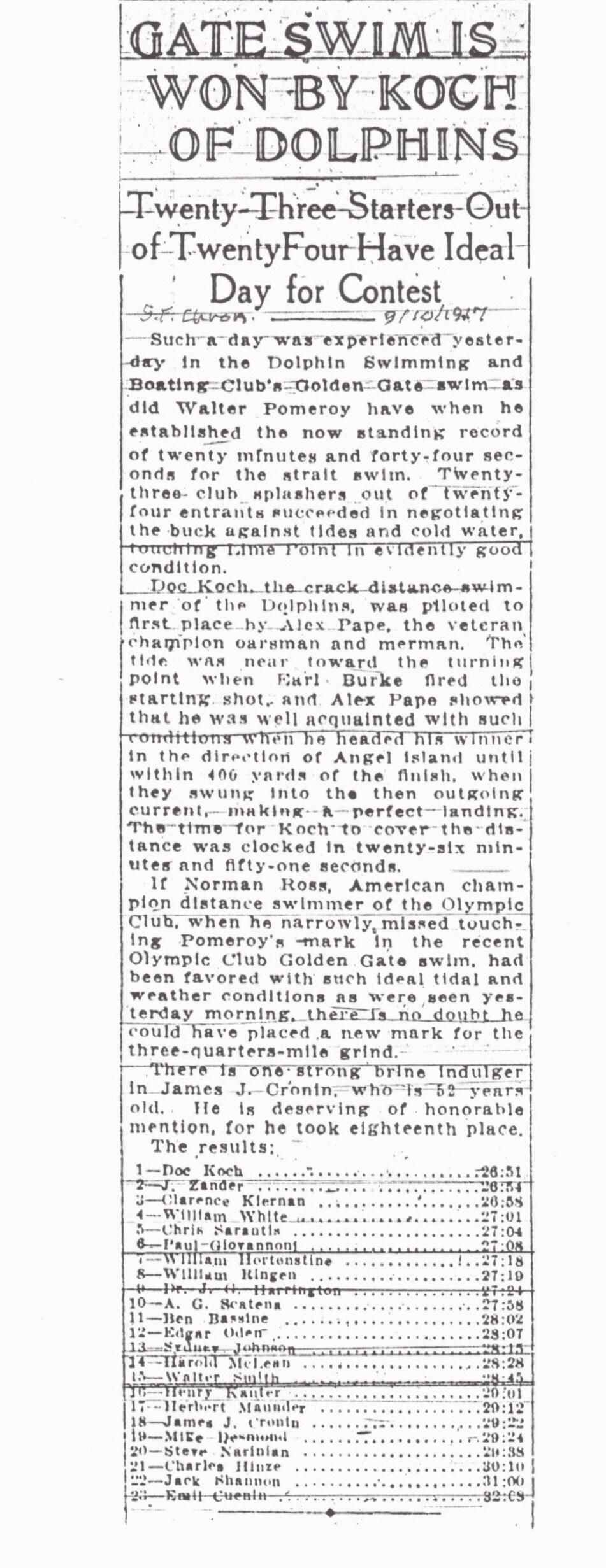Henry "Doc" Koch placed first in the club's first Golden Gate Swim on Sep 9, 1917.