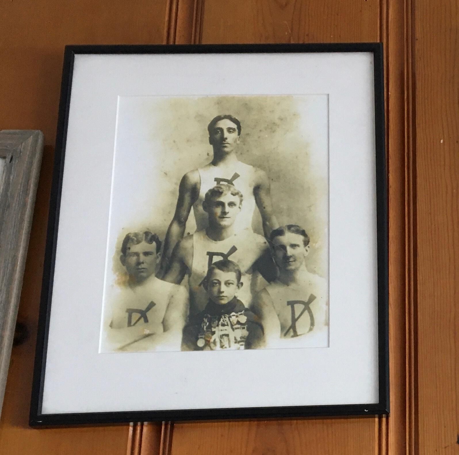 White matted photo in black frame. 4 rowers in white Dolphin Club singlets and boy coxswain in dark sweater with rowing medals.