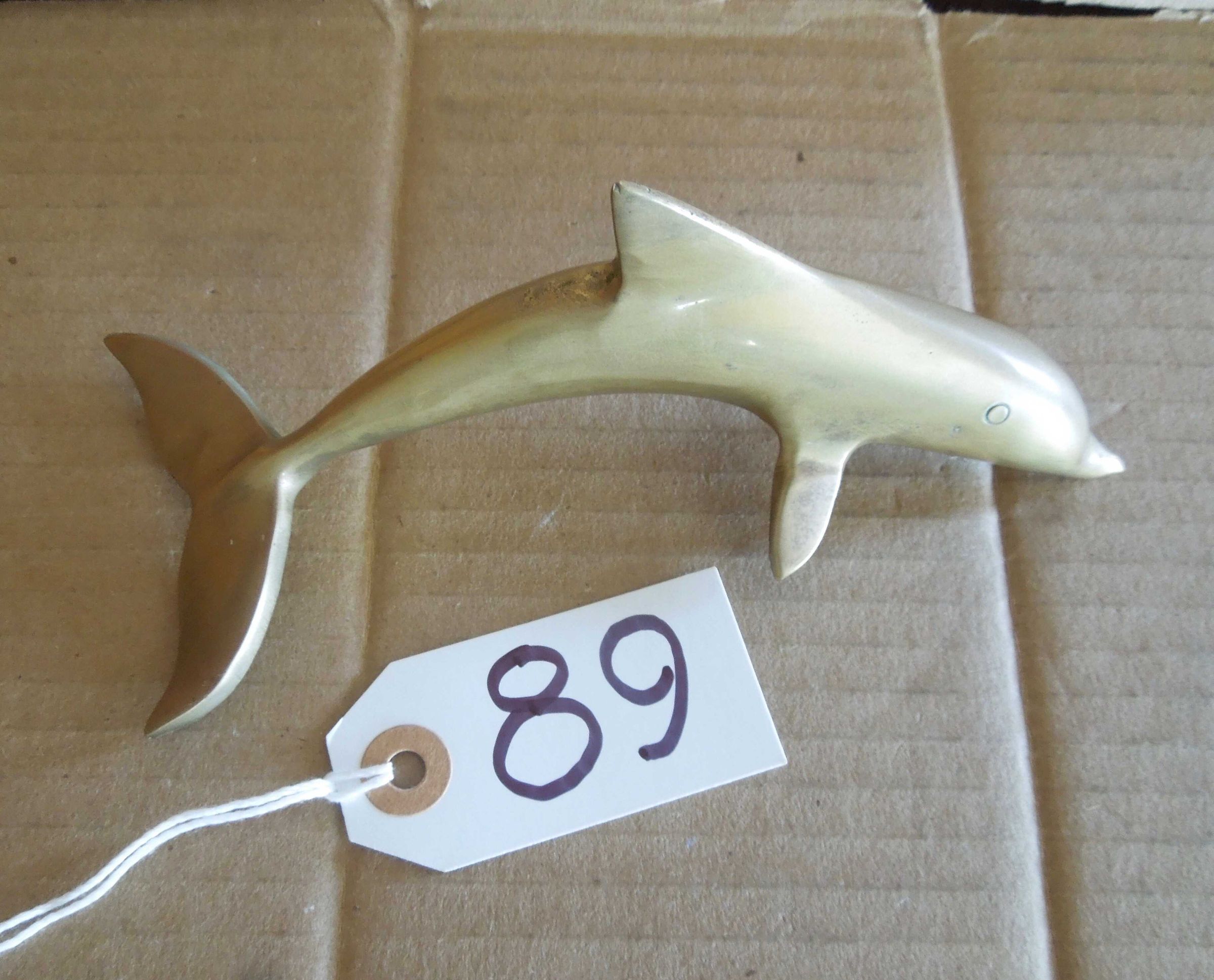 Small brass arched dolphin; heavy brass statuette with screw tip under head, 1 fin, 1 flipper, stamped eyes, no inscription