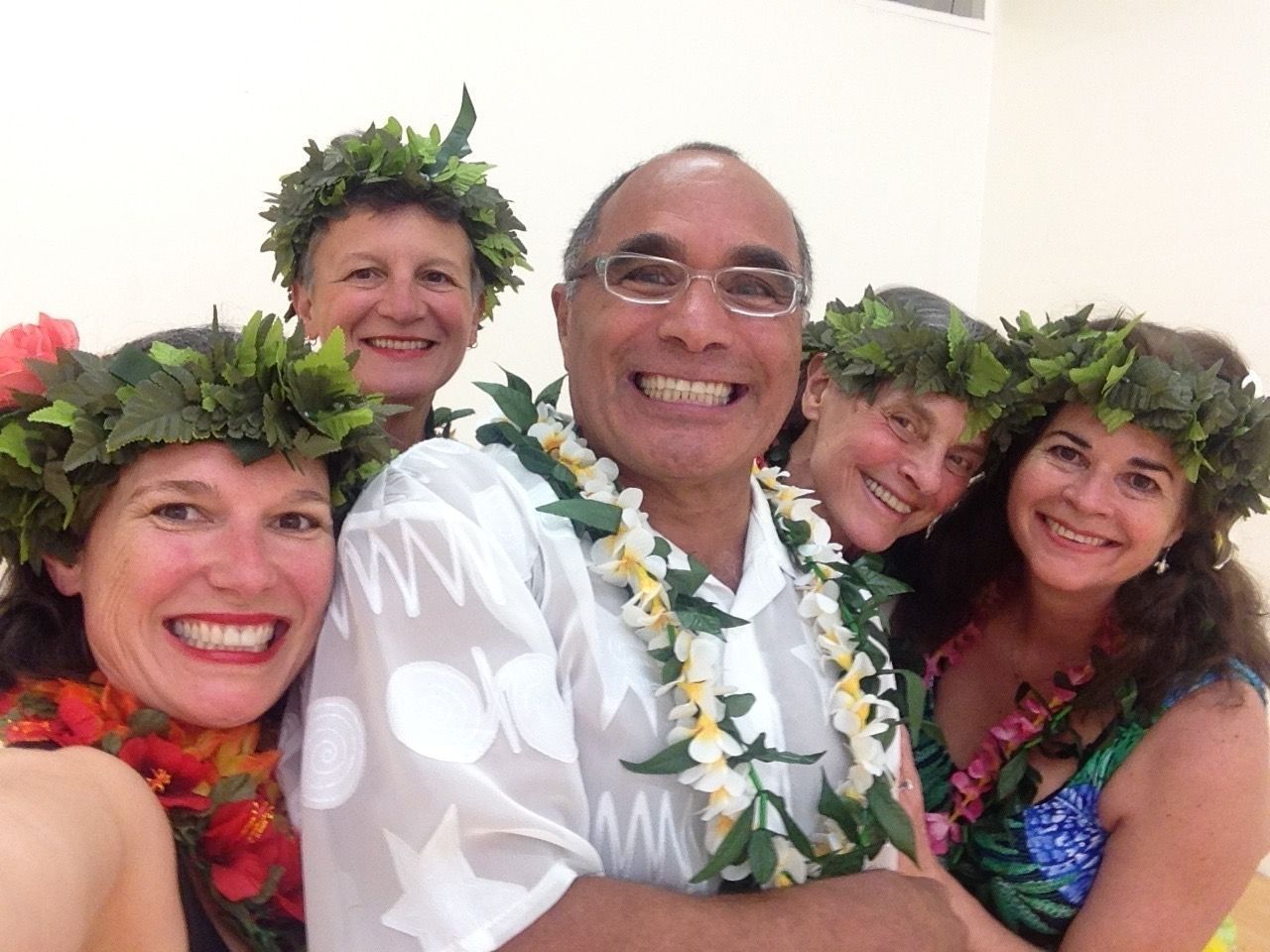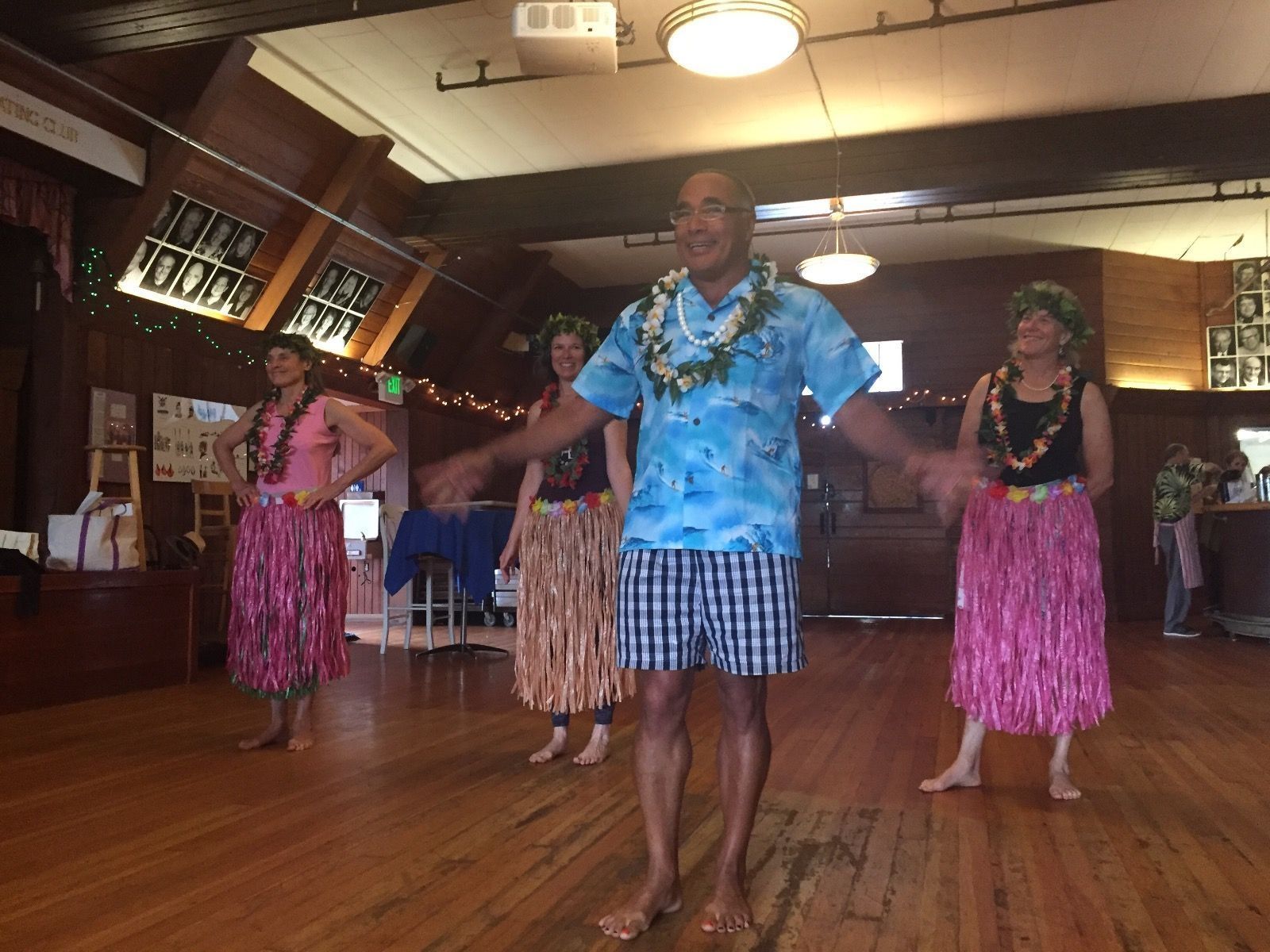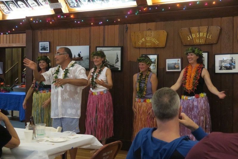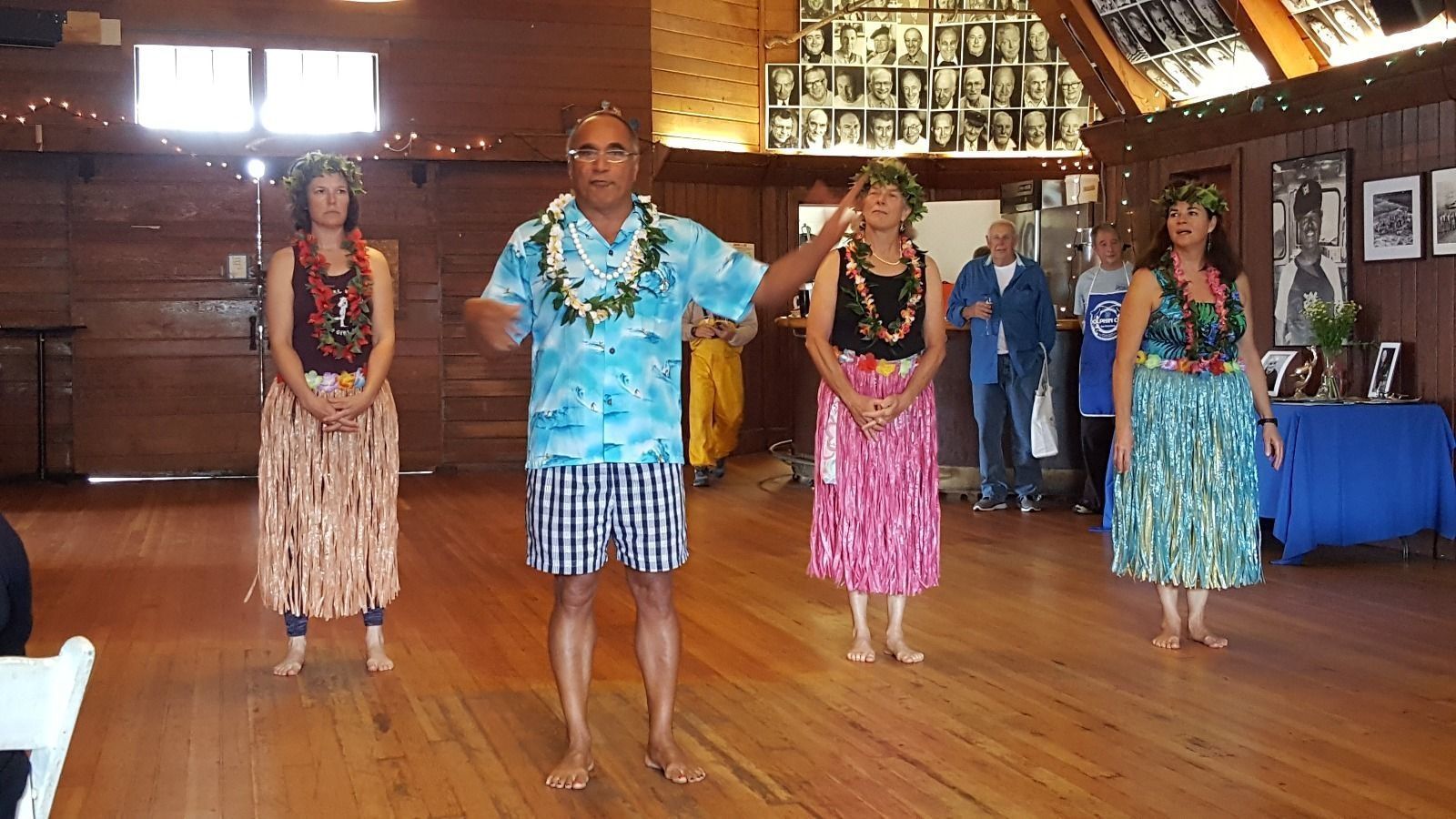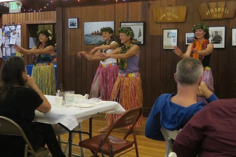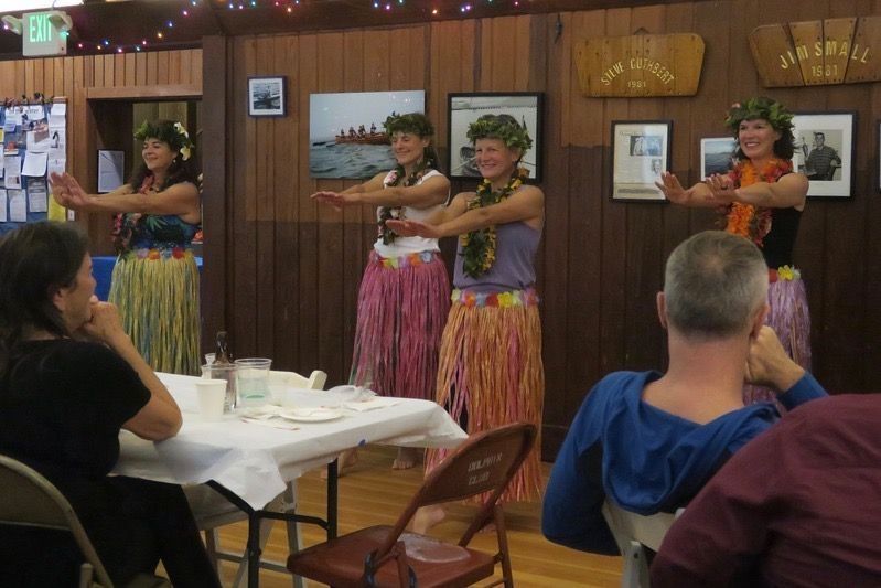 Duke Dahlin, life member, solo Channel swimmer, and hula dancer and kumu (teacher), with dancers in the second hula performance at a Pilots Appreciation Dinner, November 12, 2016.