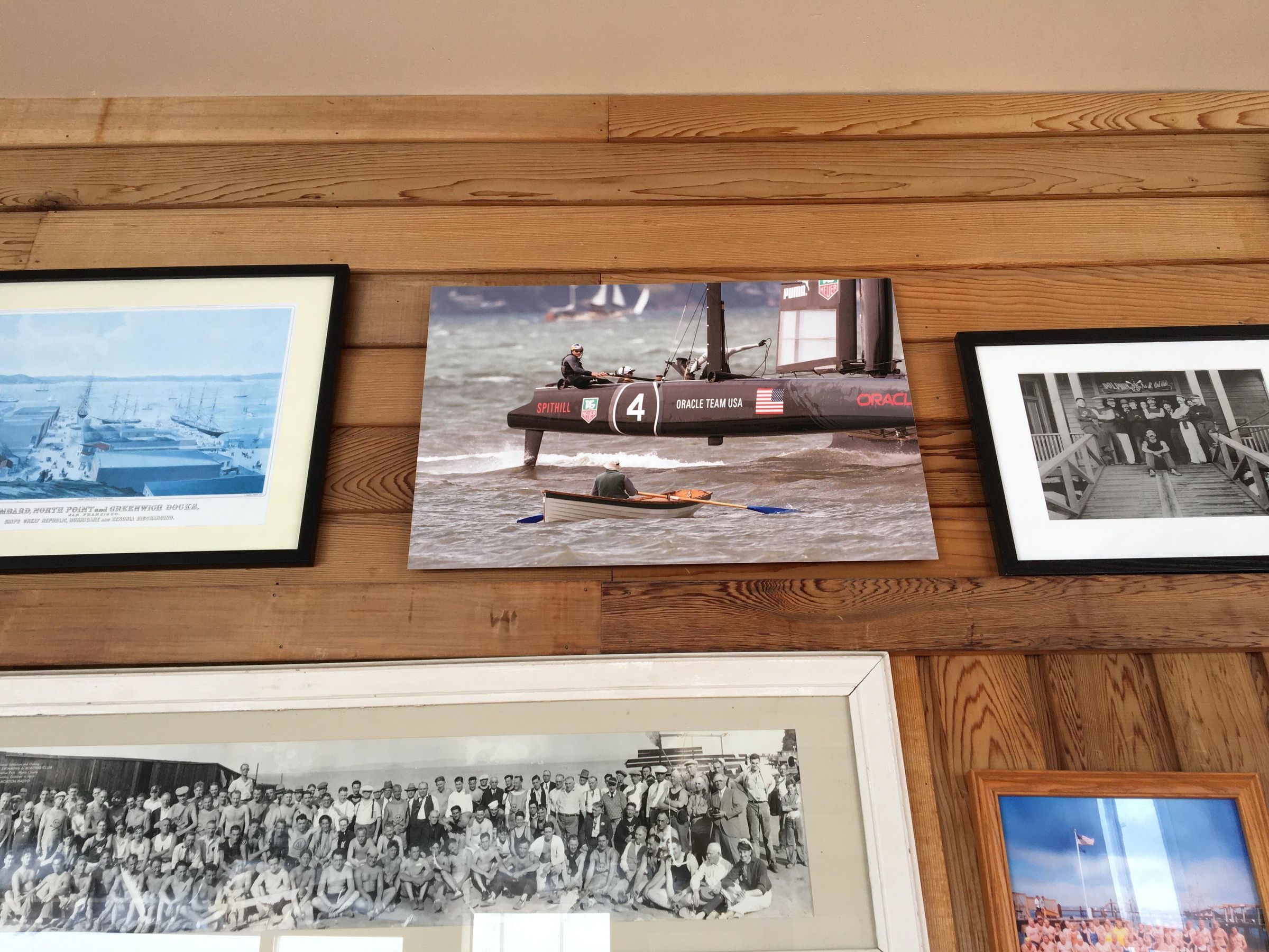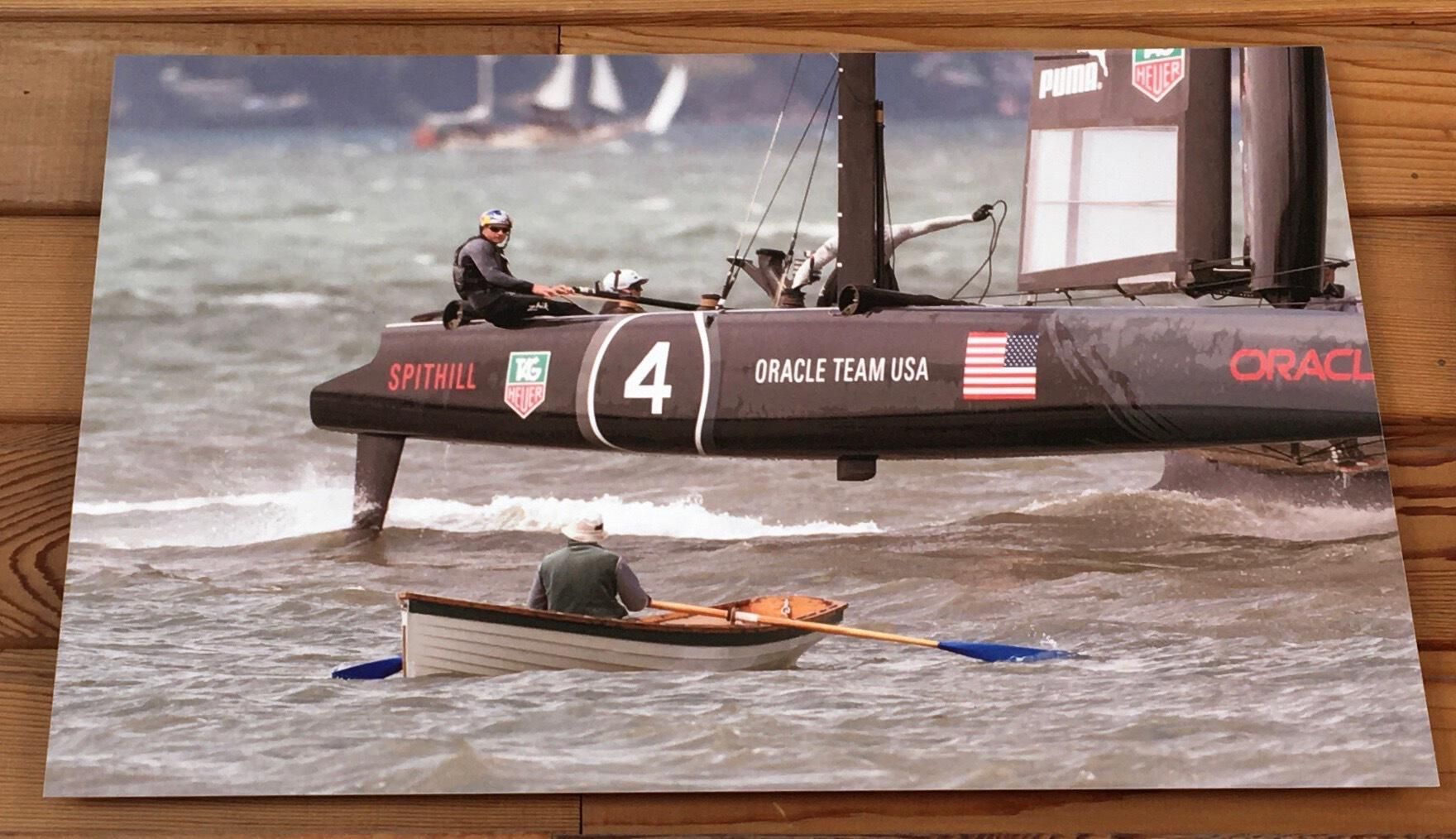 Dolphin rower Marcus Auerbuch and Oracle's AC72 wing sail catamaran at America's Cup races Summer 2012.