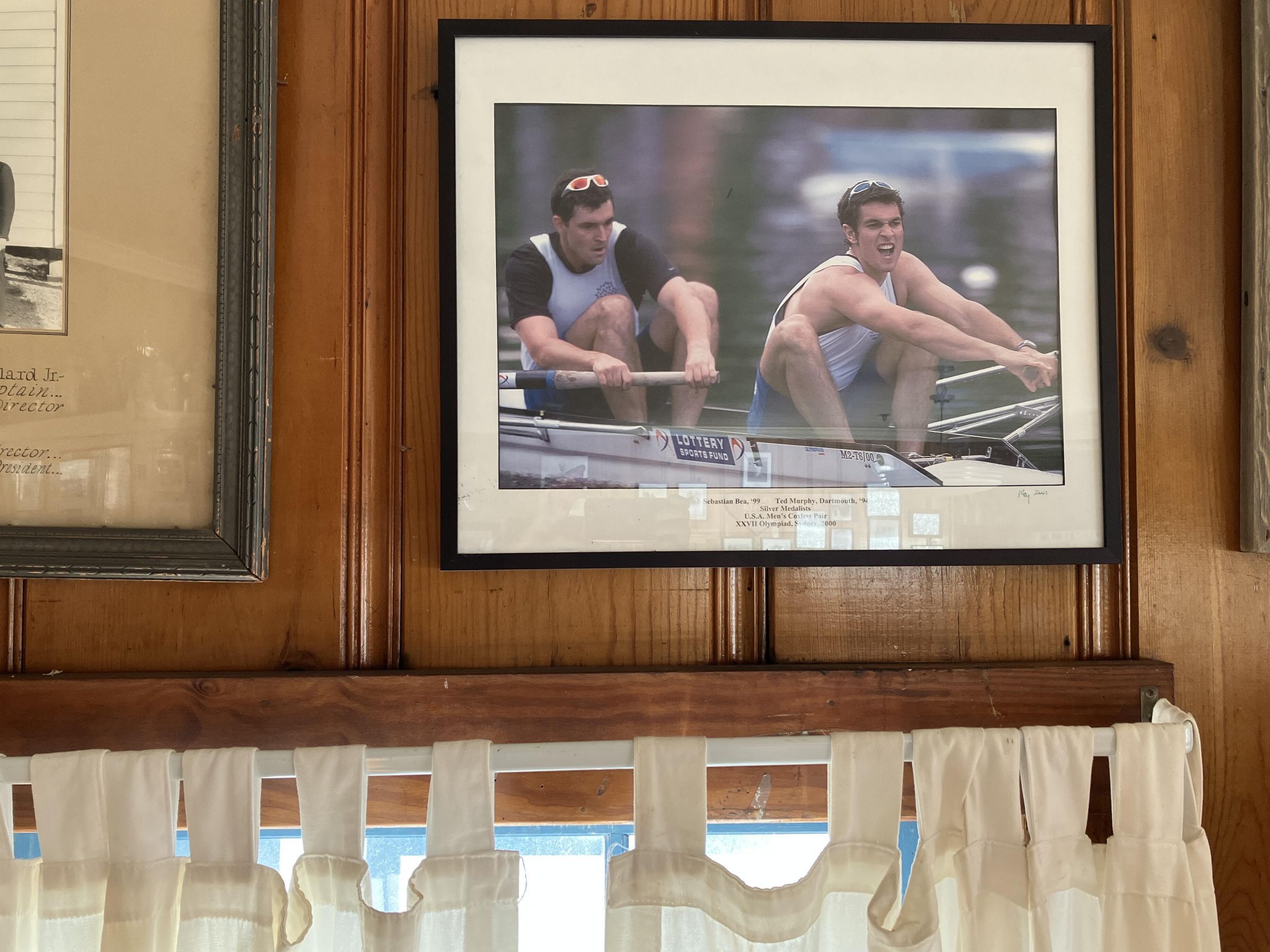 White matted color photo in black frame. Two men rowing a coxless pair boat at the 2000 Sydney Olympics.
