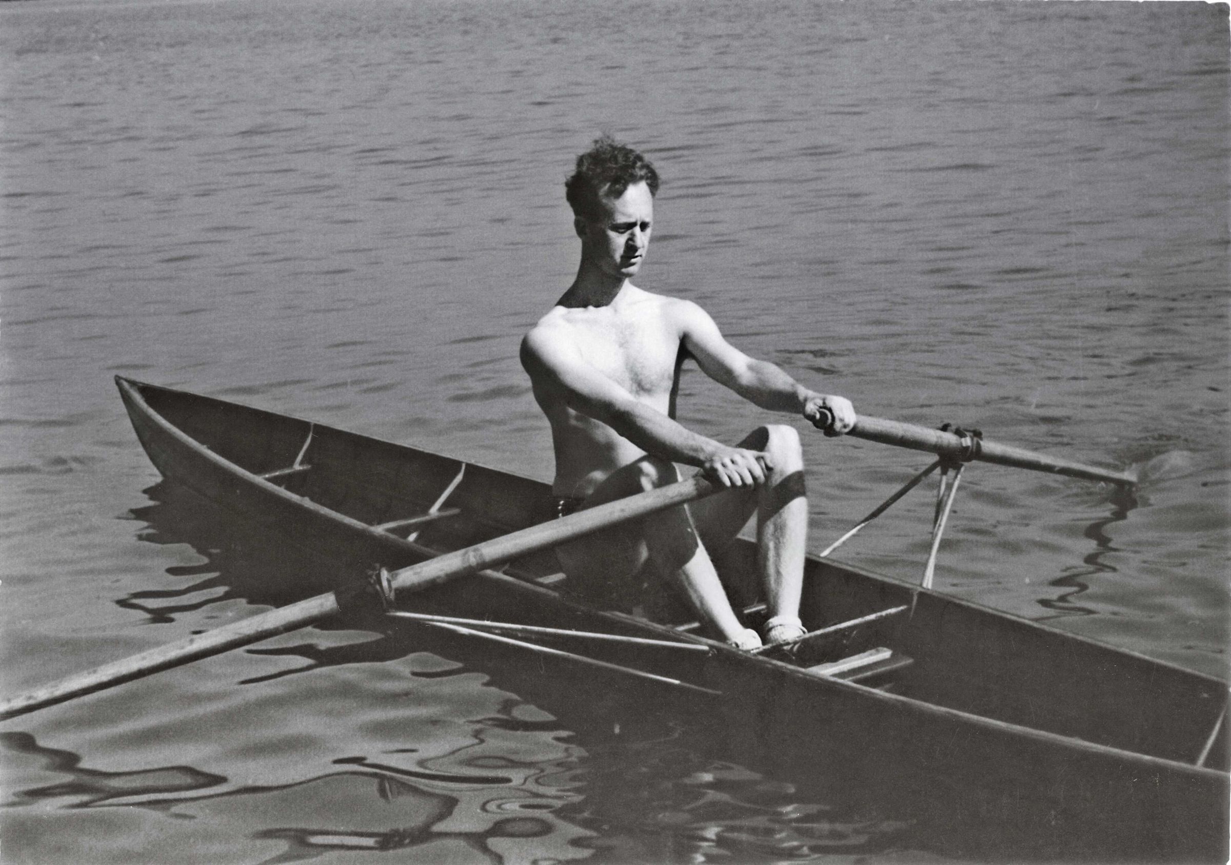 Andy Camous rowing an out-rigged skiff 1935