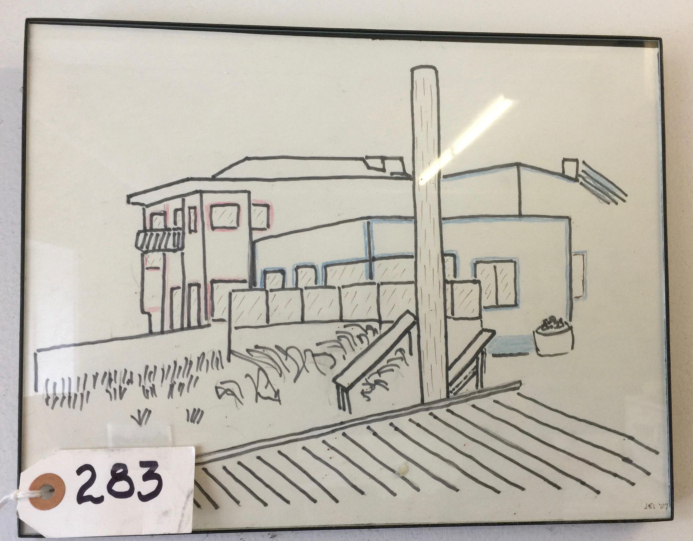 Simple black line felt tip drawing with some blue tints, shows outline of Dolphin Club and South End Rowing Club buildings from pier. In black metal frame with glass.