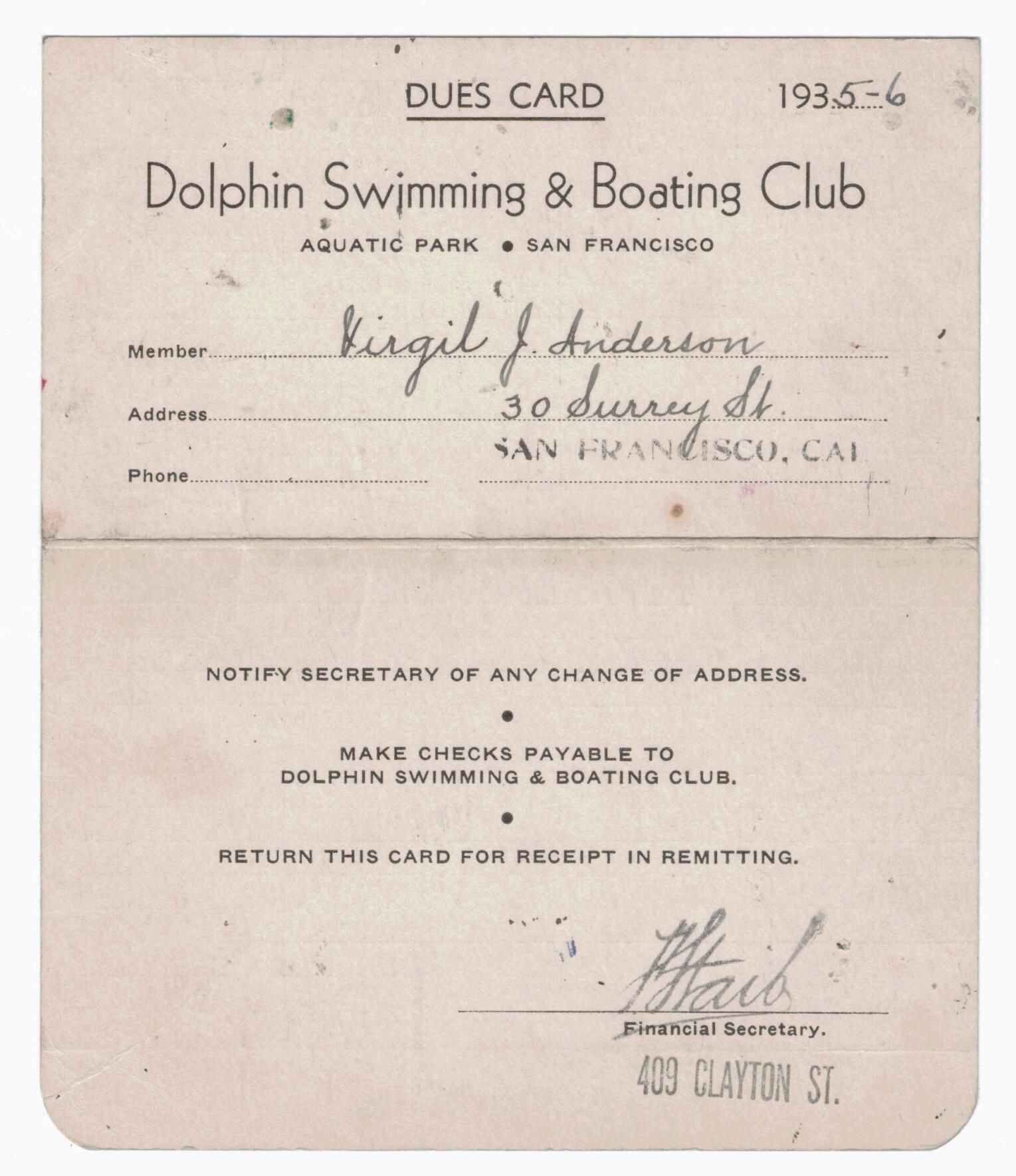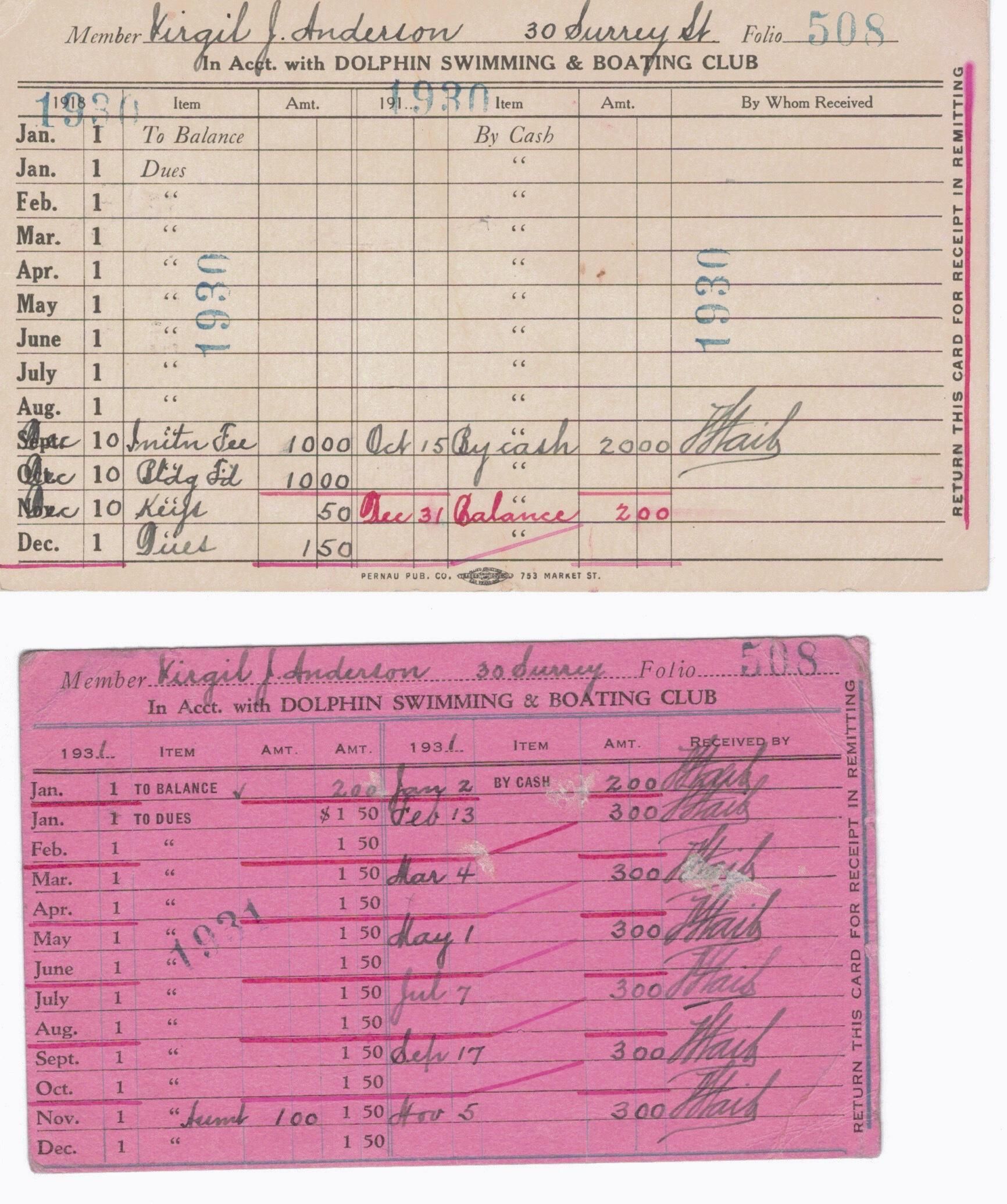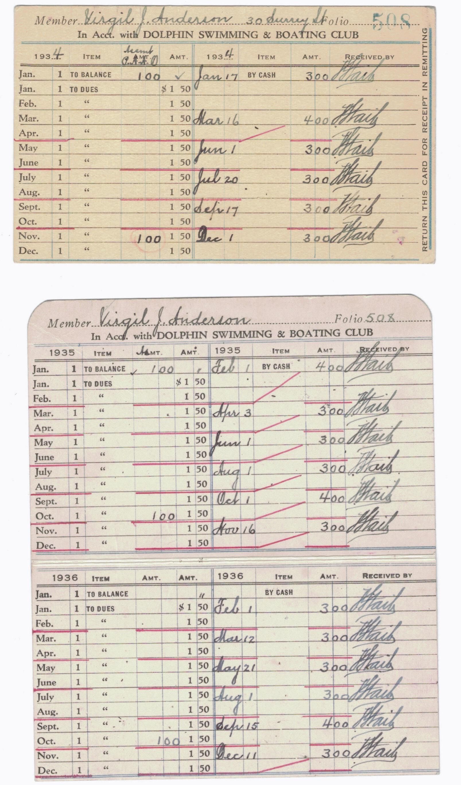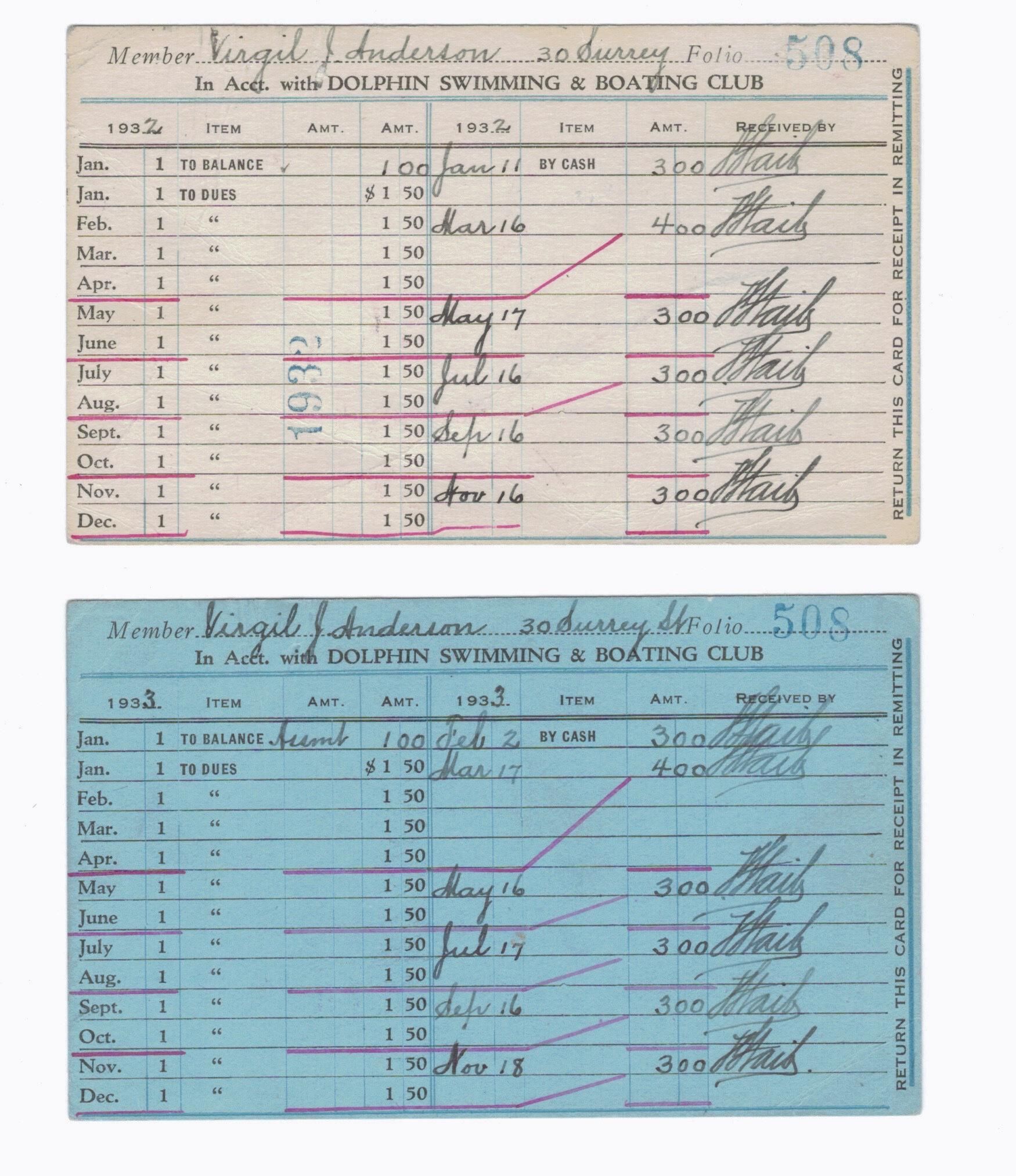 Five cards recording the monthly dues paid by Virgil Anderson to the DSBC. Annual cards for 1930,1932, 1933 ,1934, and 1935. 1935-6 dues are entered in double-sided folded card. All noted payments (dues, fees, bldg. fund) are signed by F. Staib.