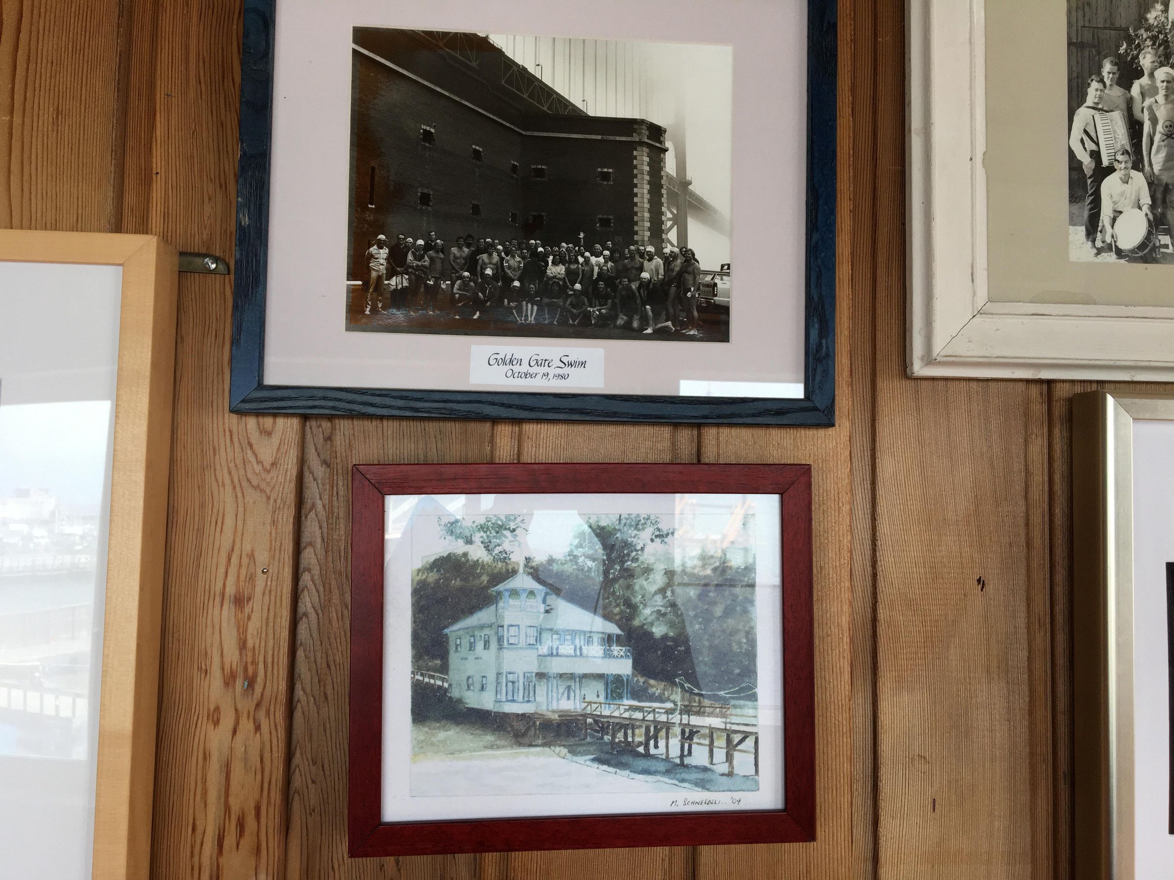 Painting of main boathouse when located at foot of Van Ness, approx. 1900. Looking from NE, shows cupola in center, part of pier.