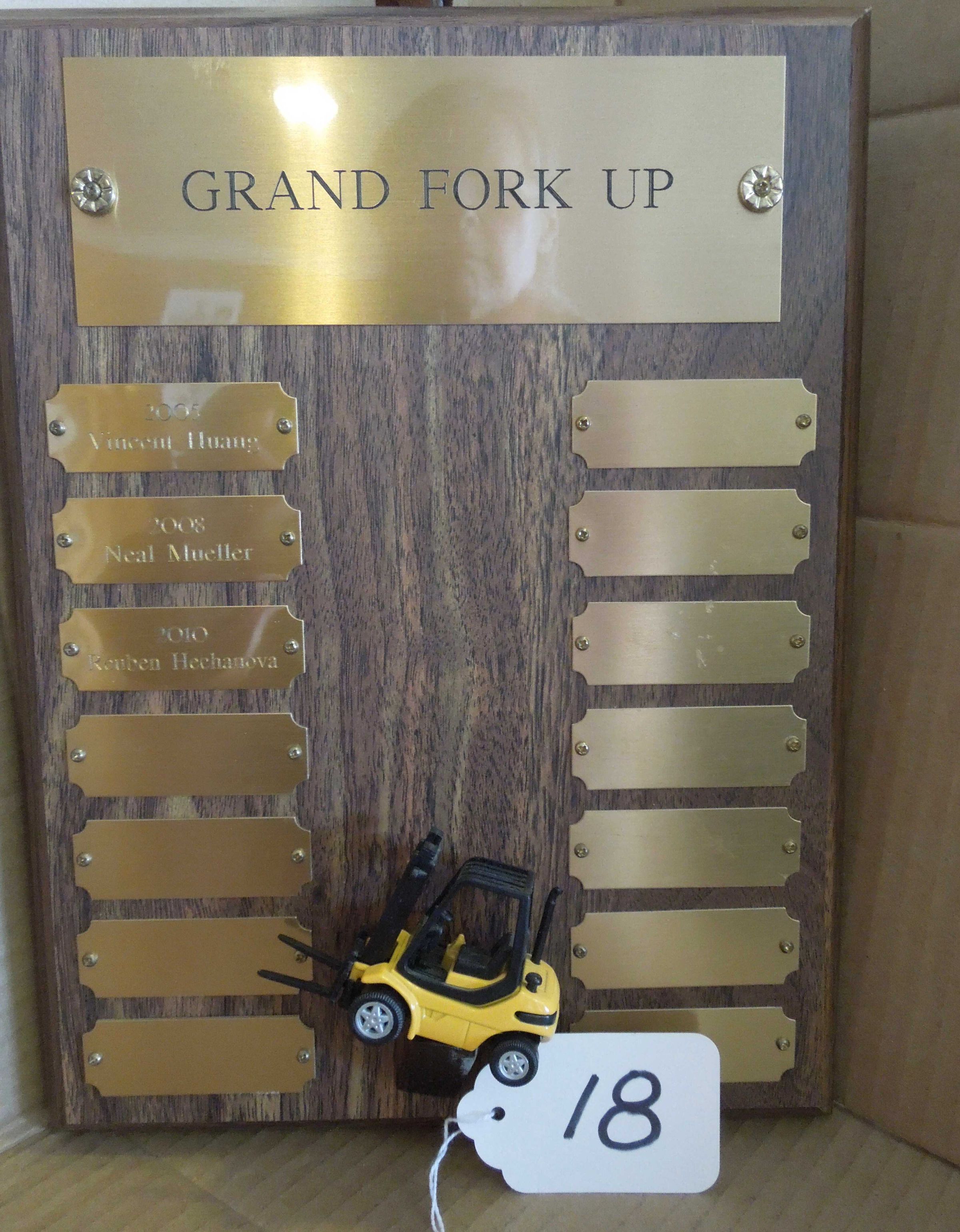 Brown faux wood rectangular plaque - gold color title plate with 14 small name plates; toy forklift (yellow and black) attached at front/bottom; Text on upper plate: Grand Fork Up (may be in reference to when a forklift fell through DC deck and/or other mishaps; 14 small gold color plates, three are engraved: "2003 Vincent Huang - 2008 Neal Mueller - 2010 Reuben Hechanova"