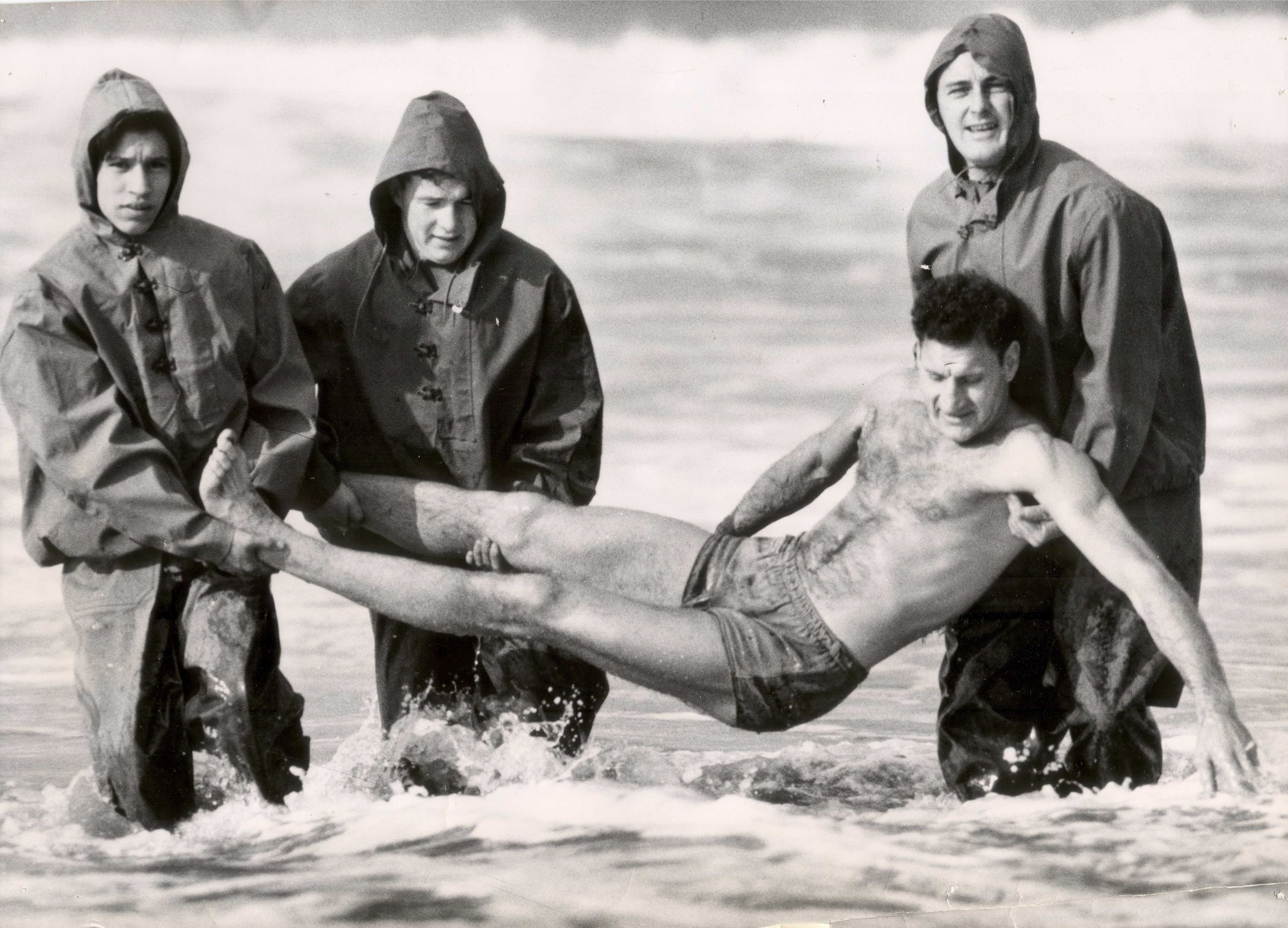Coast Guards tossing Dino Landucci into the Ocean Beach surf