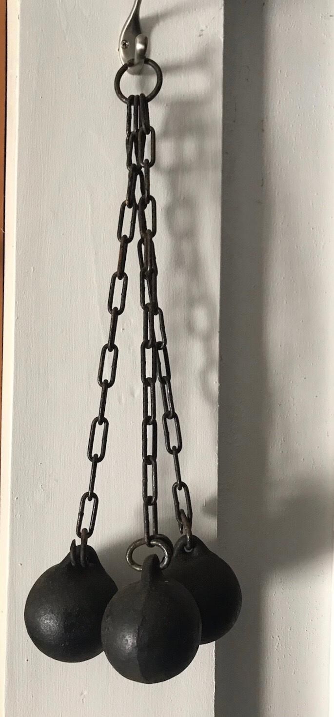 "Trinket" given to all finishers of first Escape From Alcatraz Triathlon" in July 1981. Consists black metal ring, three lengths of black metal link chain, and three black metal fishing weights each weighing 3 pounds.Use