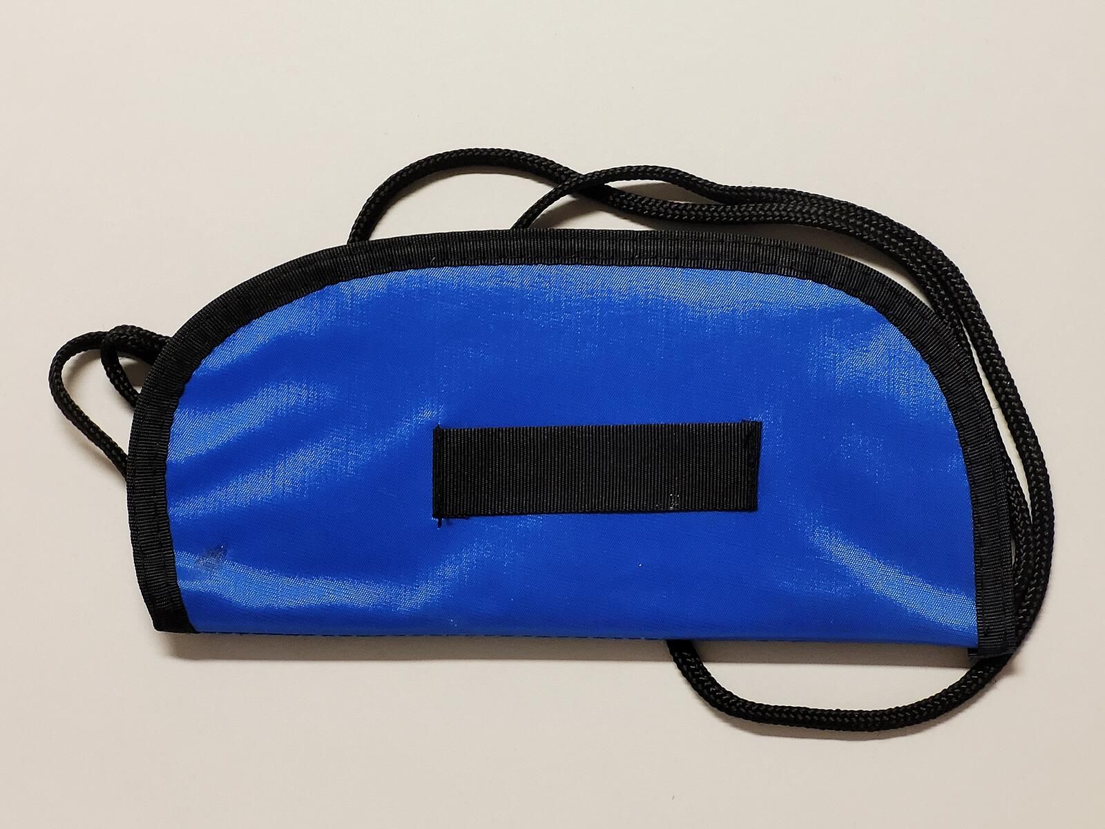 Dolphin blue pouch for eyeglasses or sunglasses. Can be attached to a belt or hung around the neck. Also provides a zippered compartment for keys or coins. White printing: Dolphin Club - logo - San Francisco Fort Point Swim - 1995.