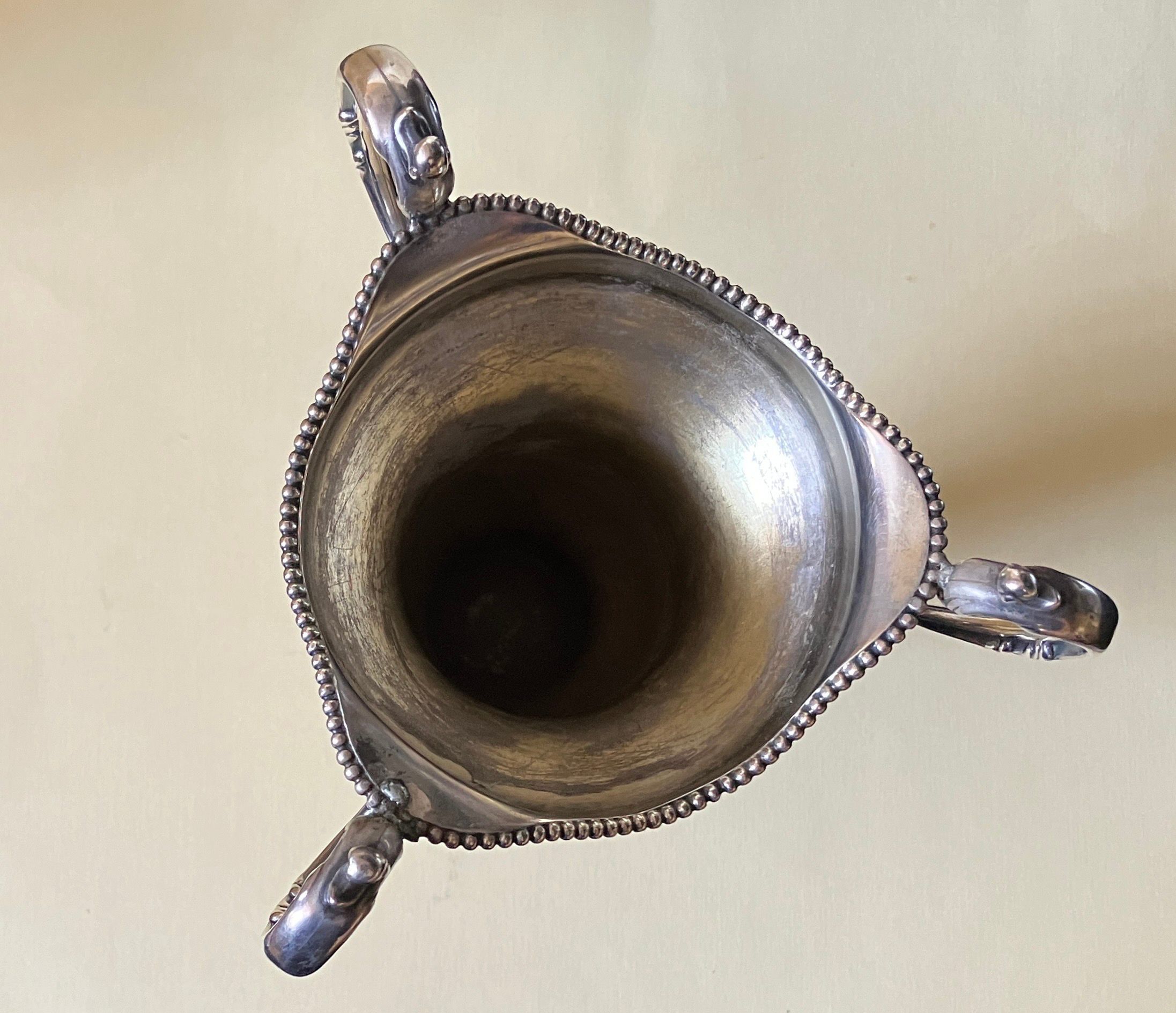 Ornate small three handled trophy cup. Top edge rises at handles and then dips down between and edge, and is decorated with tiny beads. Inscription on side 1, line drawing of DC boathouse on side 2, ornate crossed oars logo outline on side 3.