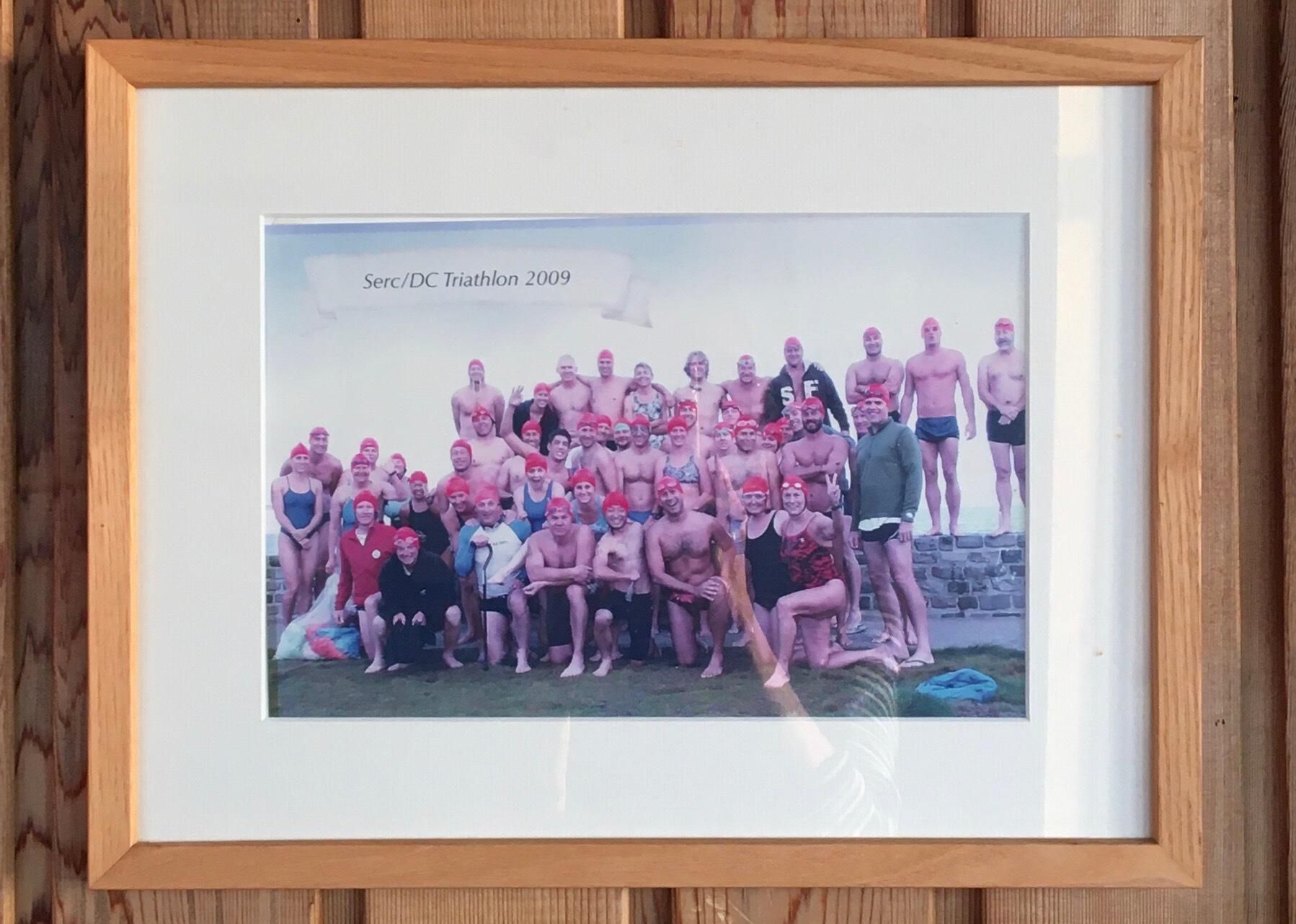 Dolphin swimmers posing at Yacht Harbor before swimming leg of Dolphin vs. South End Triathlon. Color photo, light color wood frame, white mat, glass.