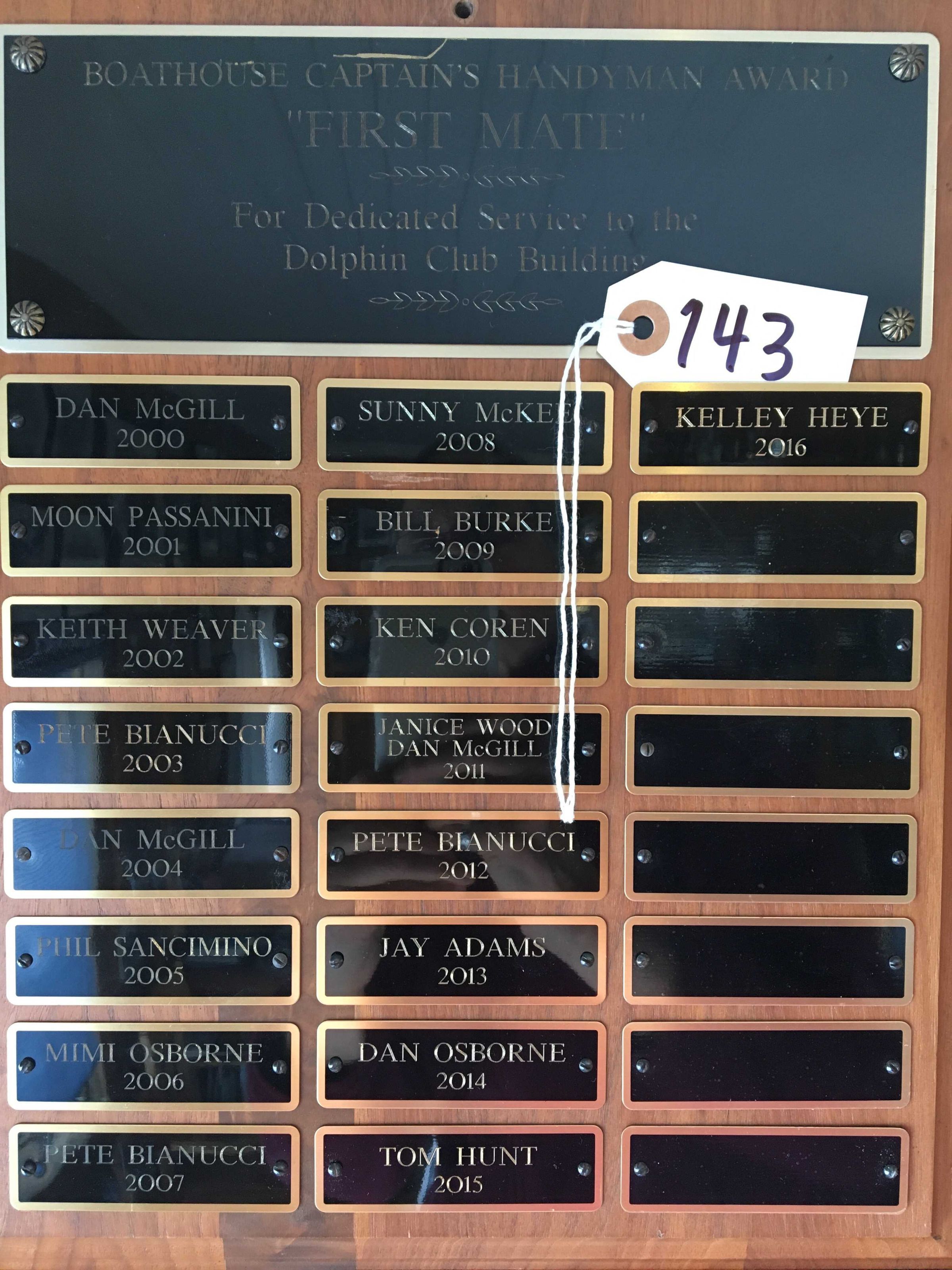 Text on title plate: "Boathouse Captain's Handyman Award - FIRST MATE - For Dedicated Service to the - Dolphin Club Building"