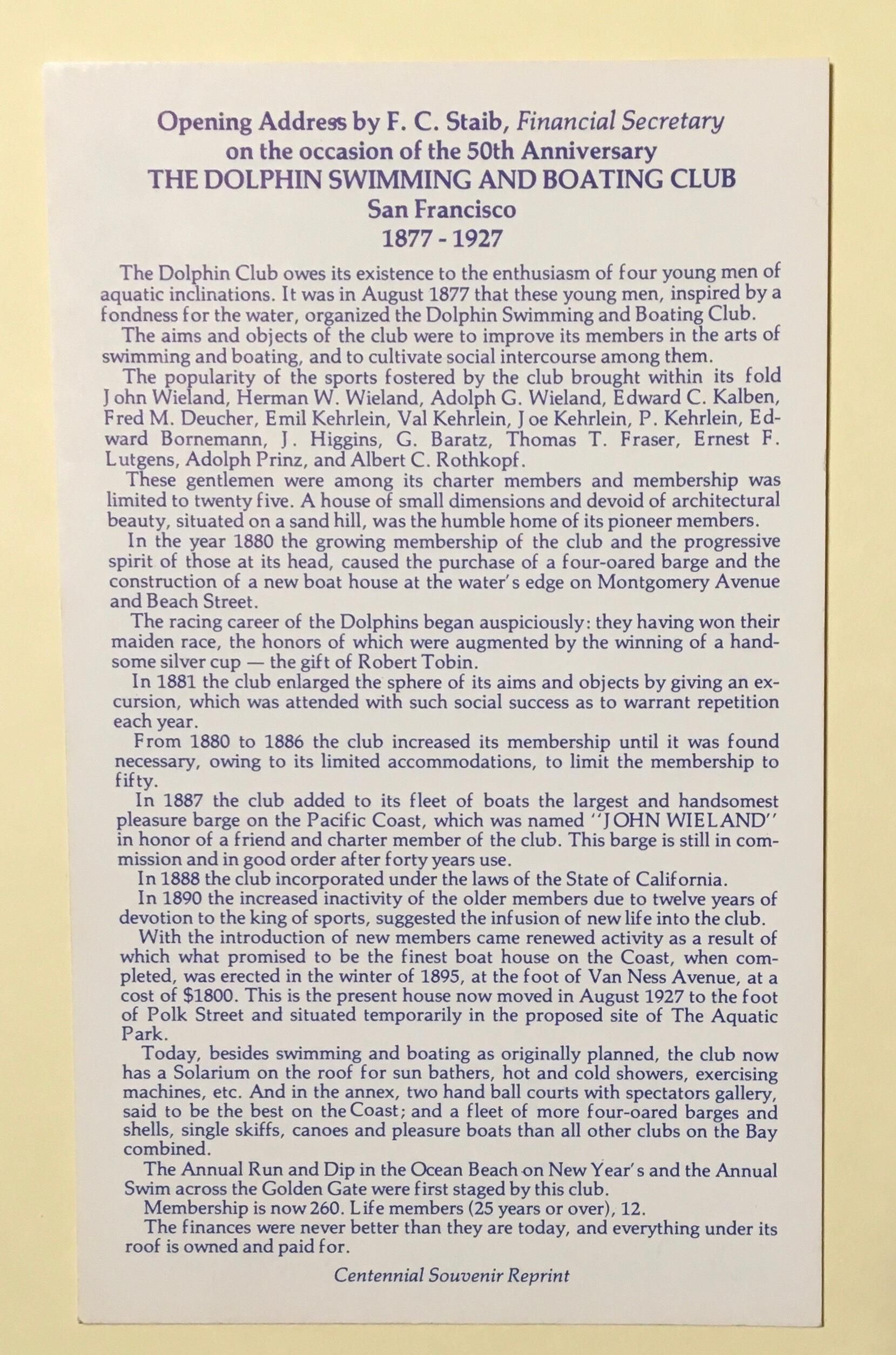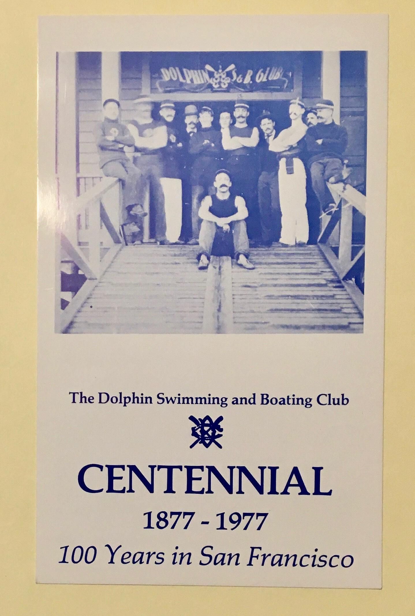 Flyer for Dolphin Club centennial year 1977. Blue ink on white card. On front is photo of members circa 1900 (see photo 190011) and title. On back is text of address by F.C. Staib on occasion of 50th anniversary in 1927.