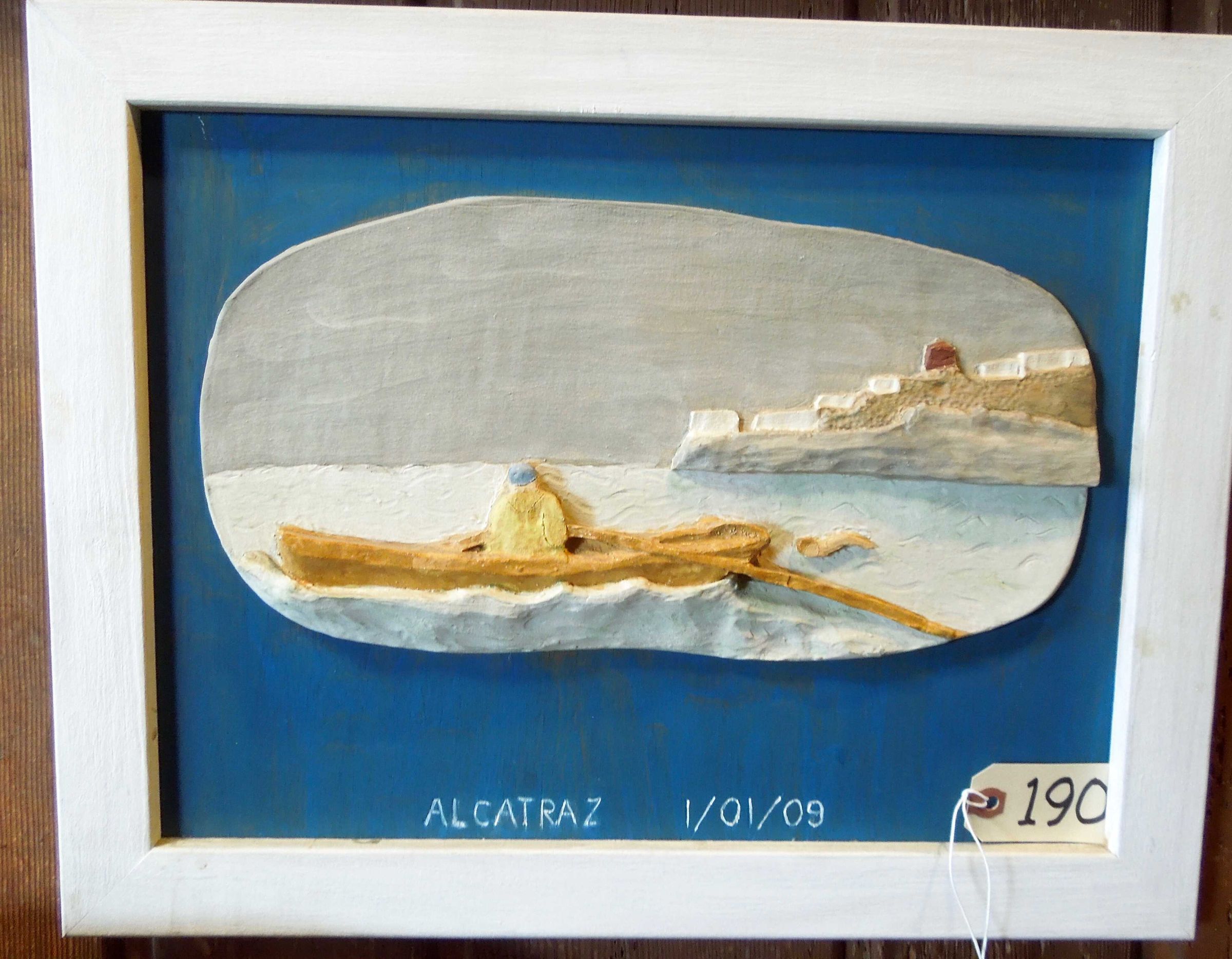 Painted clay raised image of rower in boat with Alcatraz in background. White lettering below: Alcatraz 1/01/09Made/Created