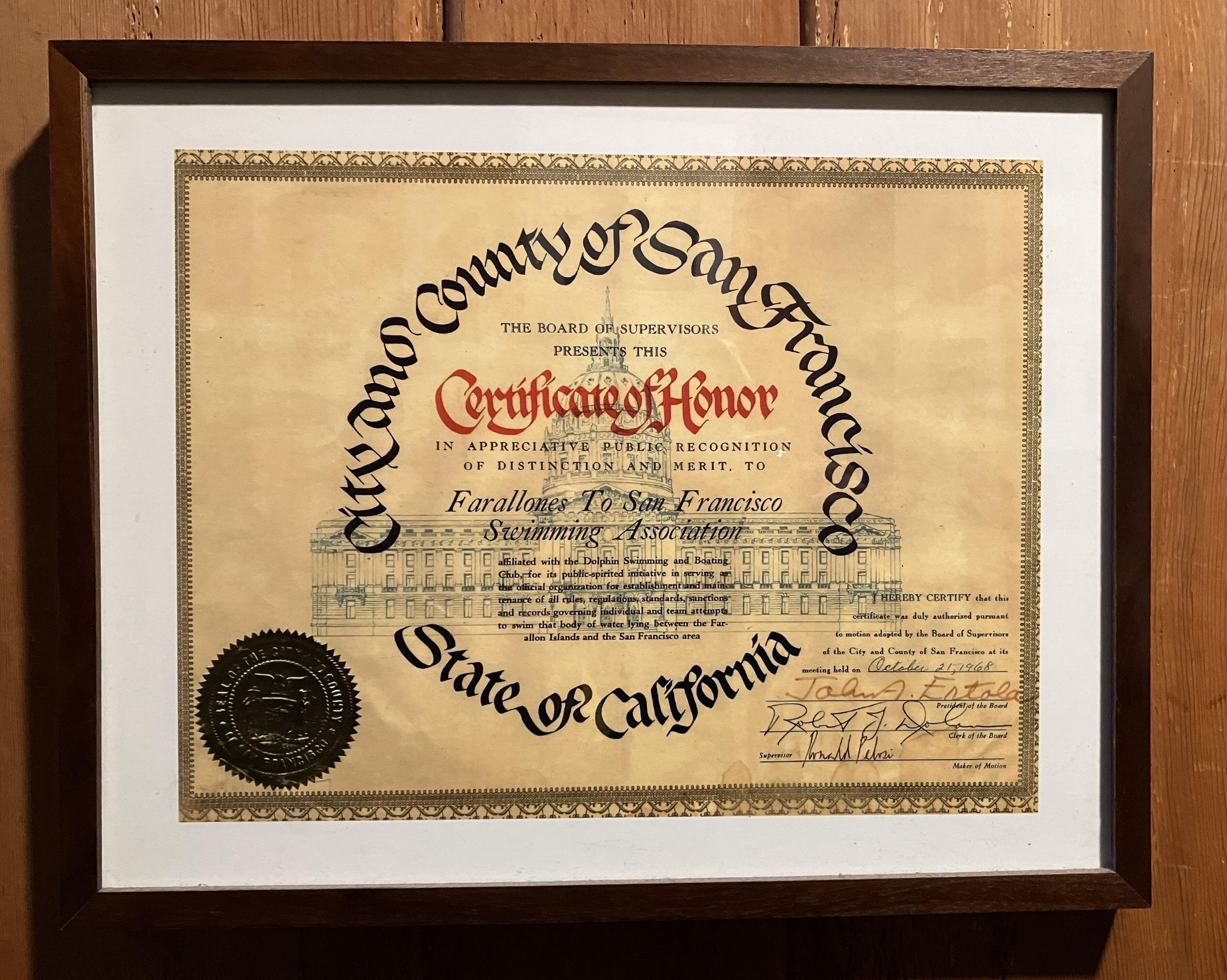 Framed "Certificate of Honor" from SFCity and County in appreciation to the "Farallones To San Francisco Swimming Association" affiliated with th Dolphin Swimming and Boating Club.