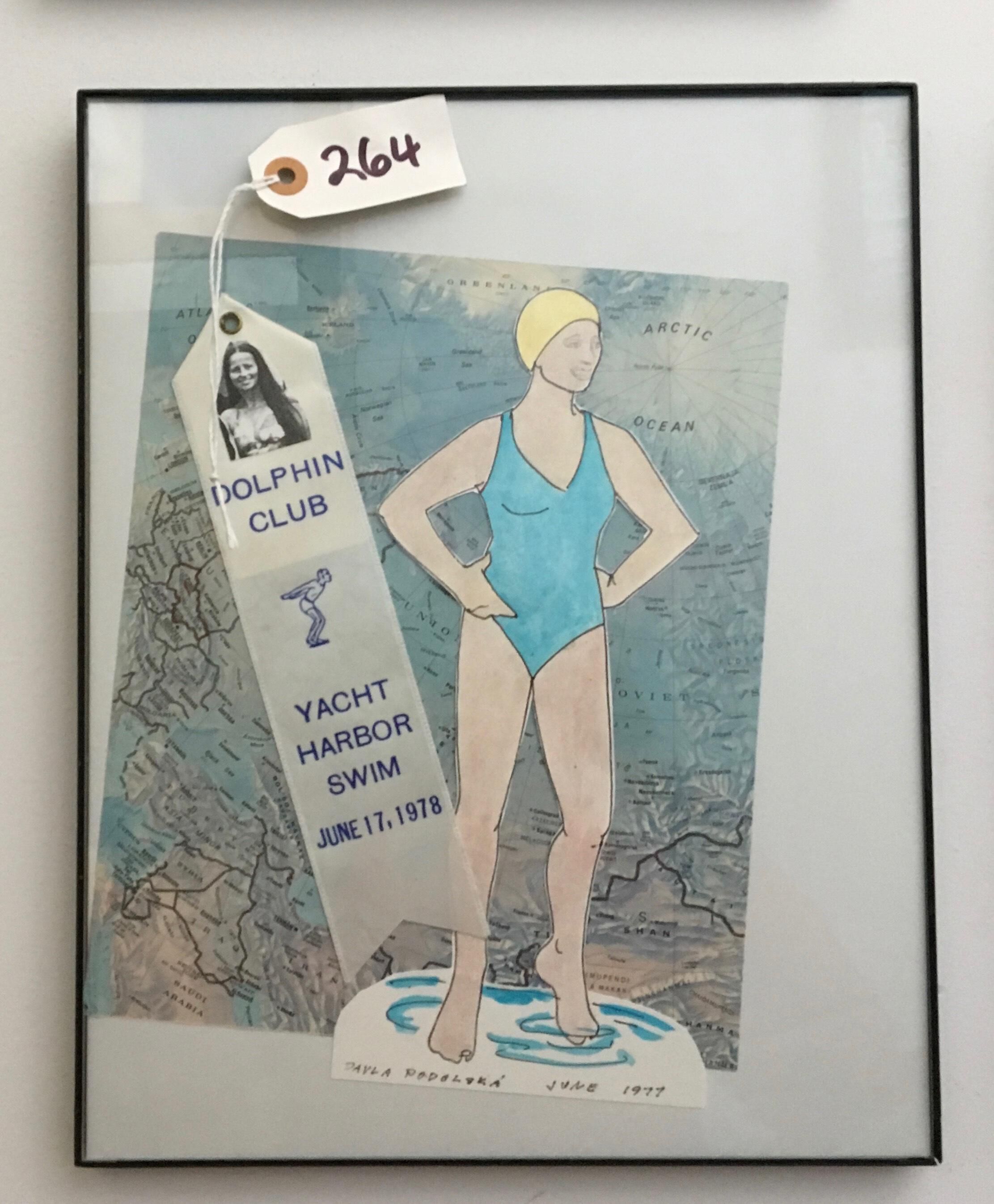 Framed collage composed of white swim ribbon and paper cut out female figure in turquoise suit mounted on a map of Europe and the Middle East.