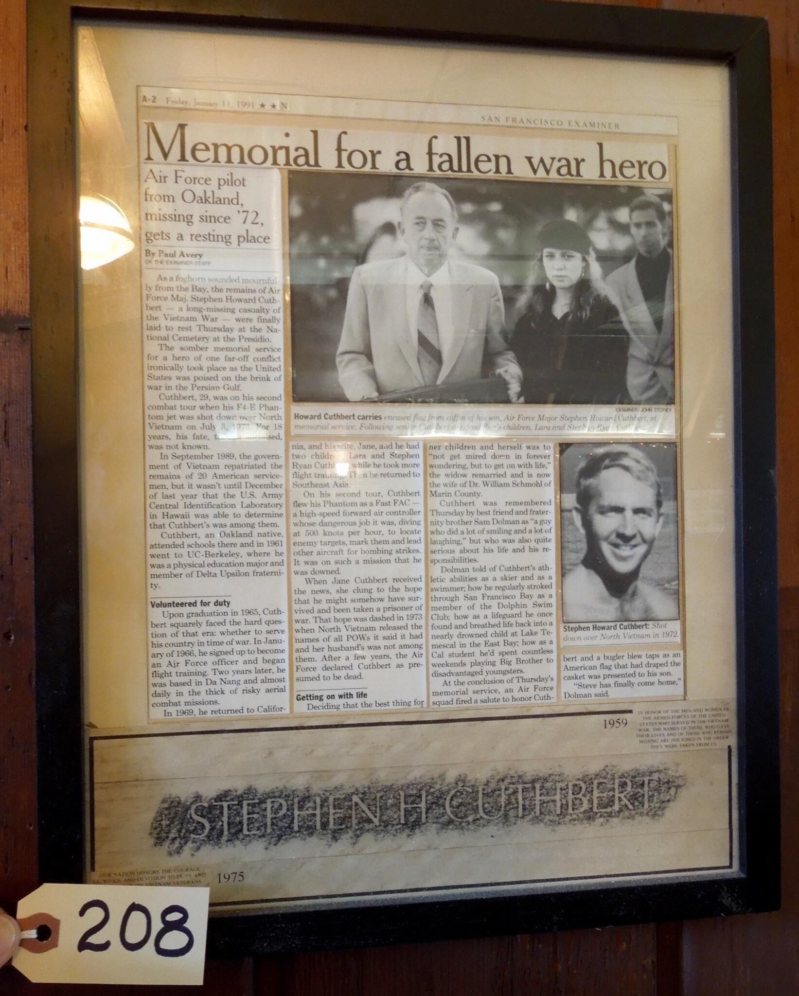 Framed San Francisco Examiner article "Memorial for a fallen war hero" Steve Cuthbert.