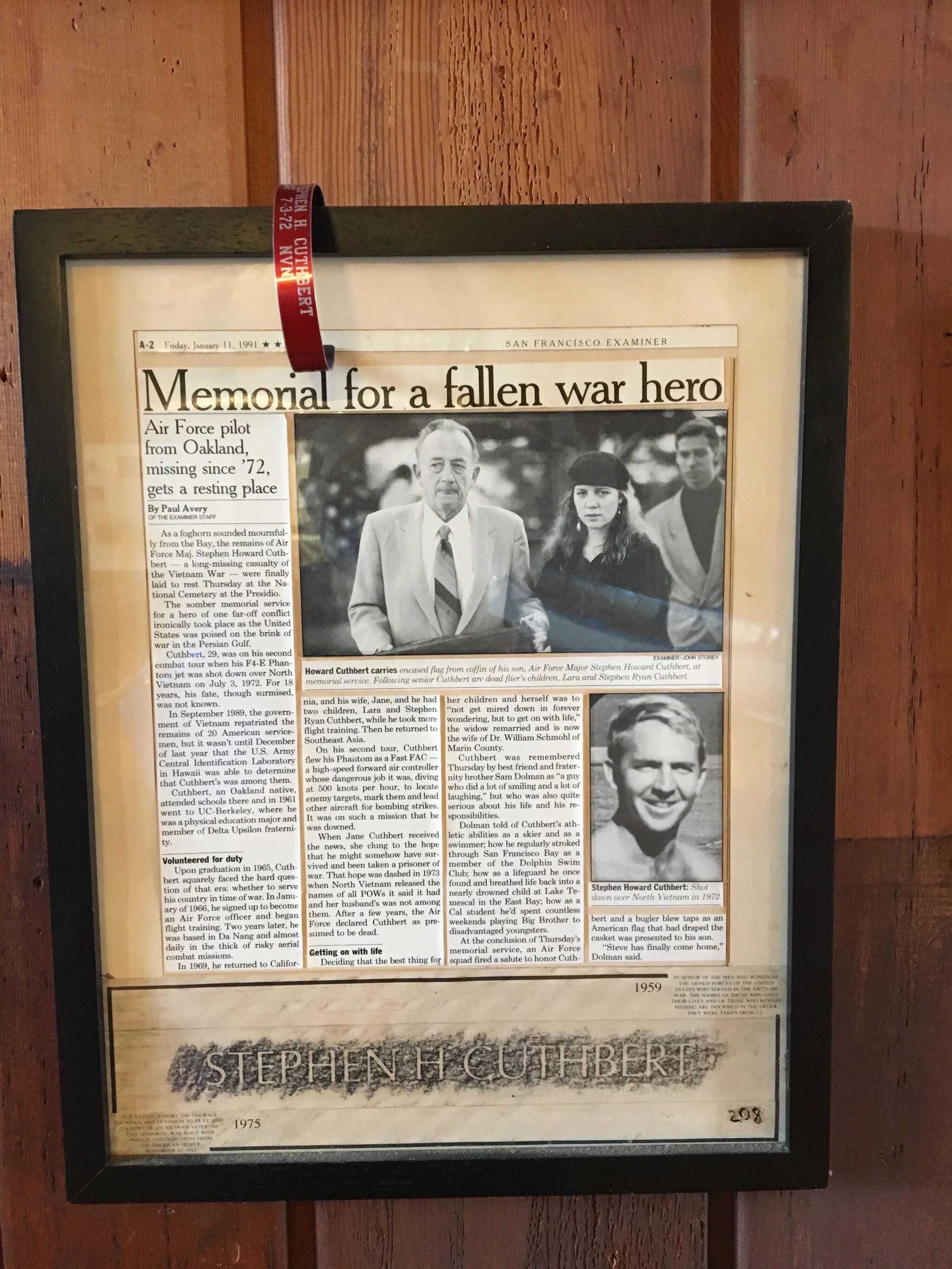 Steven Cuthbert joined the Dolphin Club in July 1962 and was a top swimmer. He became an Air Force pilot during the Vietnam war and went missing in action in 1972. This article reports the return of his remains and the memorial service in 1991.