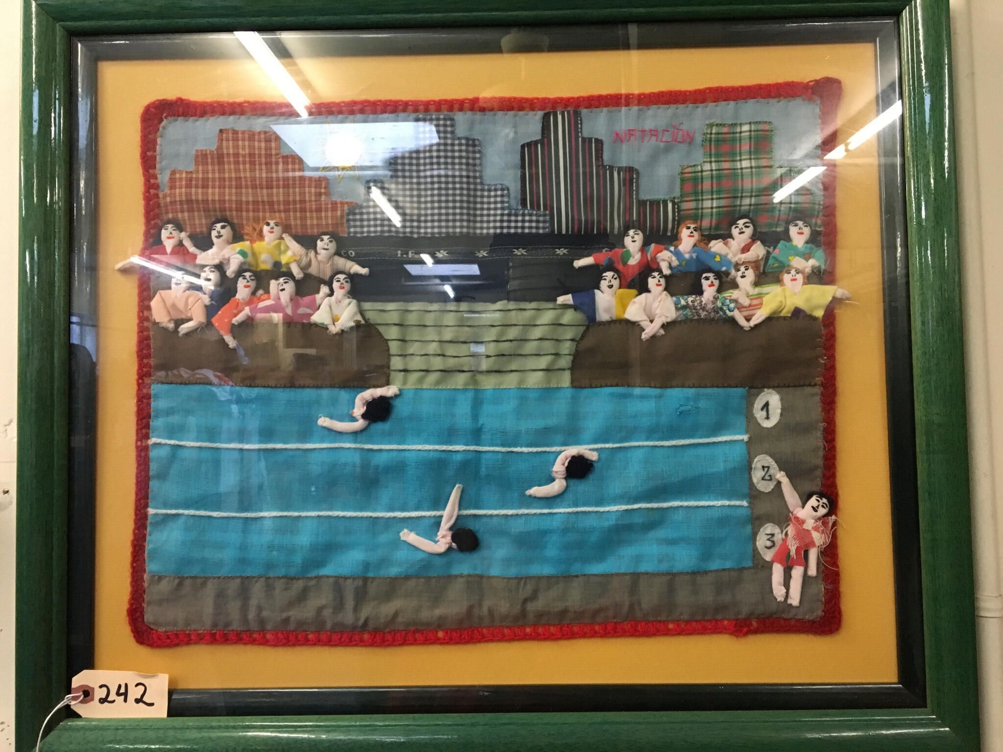 Sewn, applique'd and padded image of female swimmers racing in a three lane pool, with female onlookers in bleachers, under an urban skyline. Red border mounted on yellow fabric in green frame. Glass on frame.