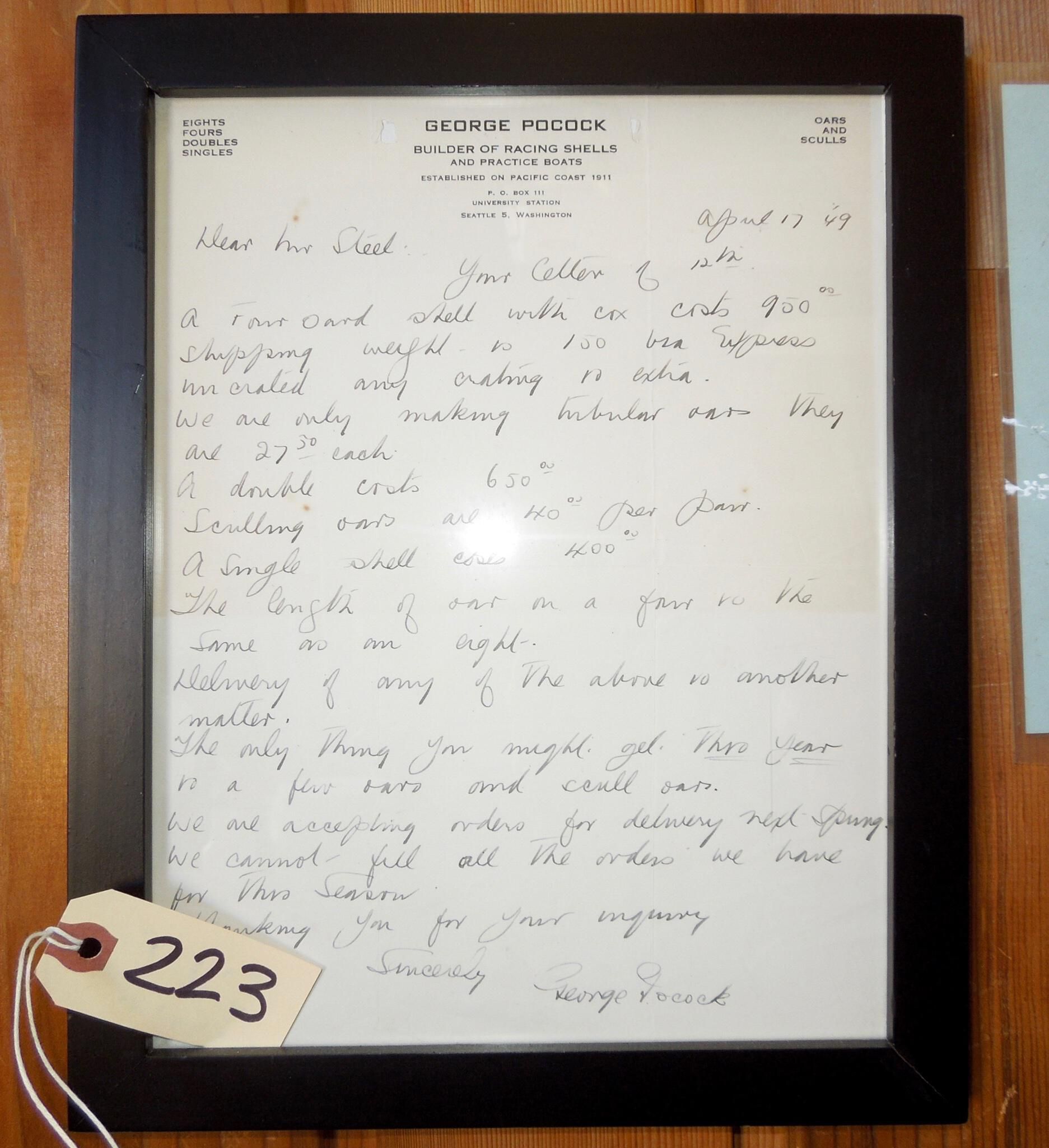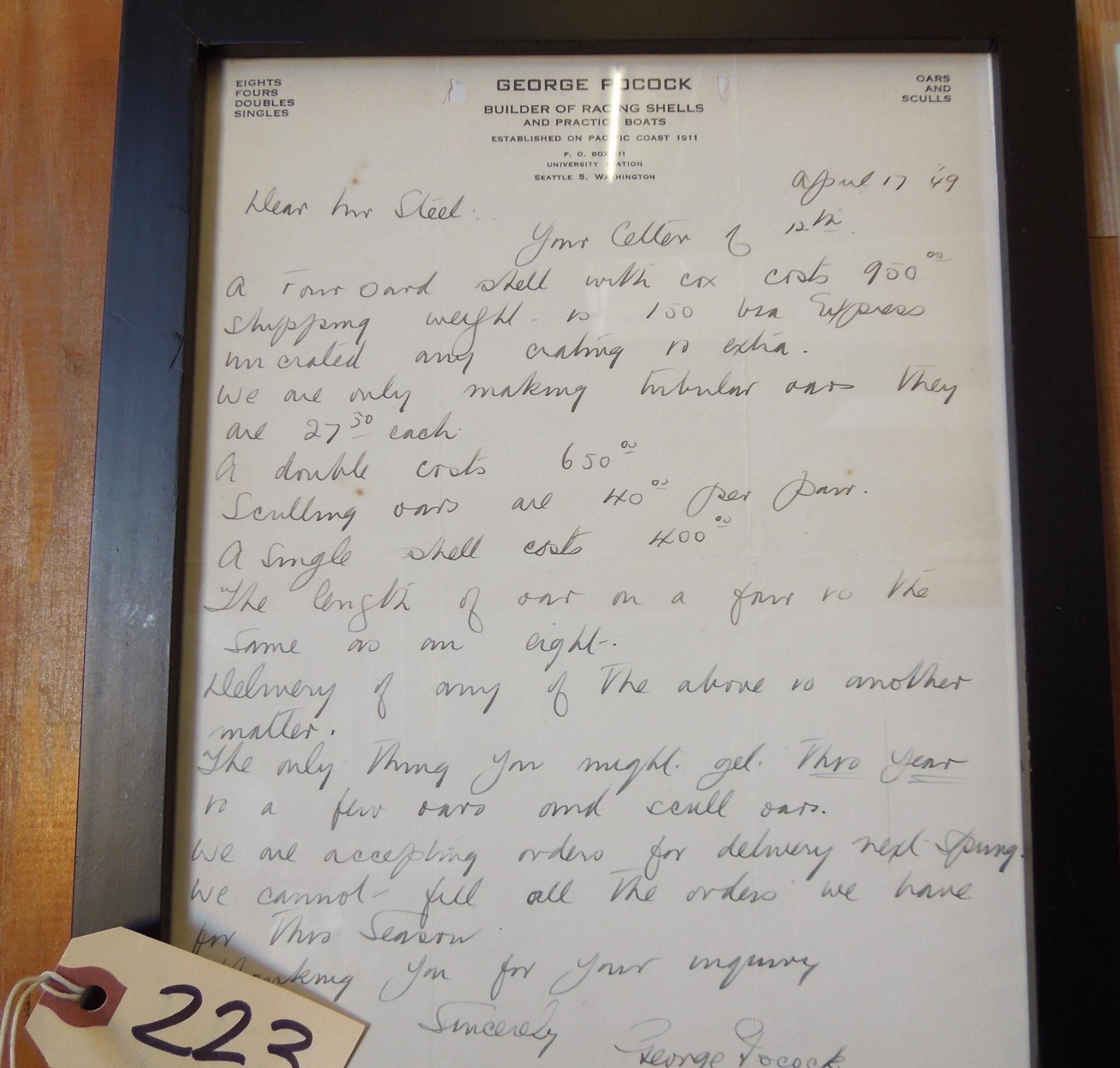 Written by George Pocock, rower, designer and builder of racing shells. Company based Seattle, WA. Famous for cedar racing boat. Hand written letter quotes prices of boats & oars, and delivery time. Addressed to Mr (Malcolm) Steel.Made/Created
