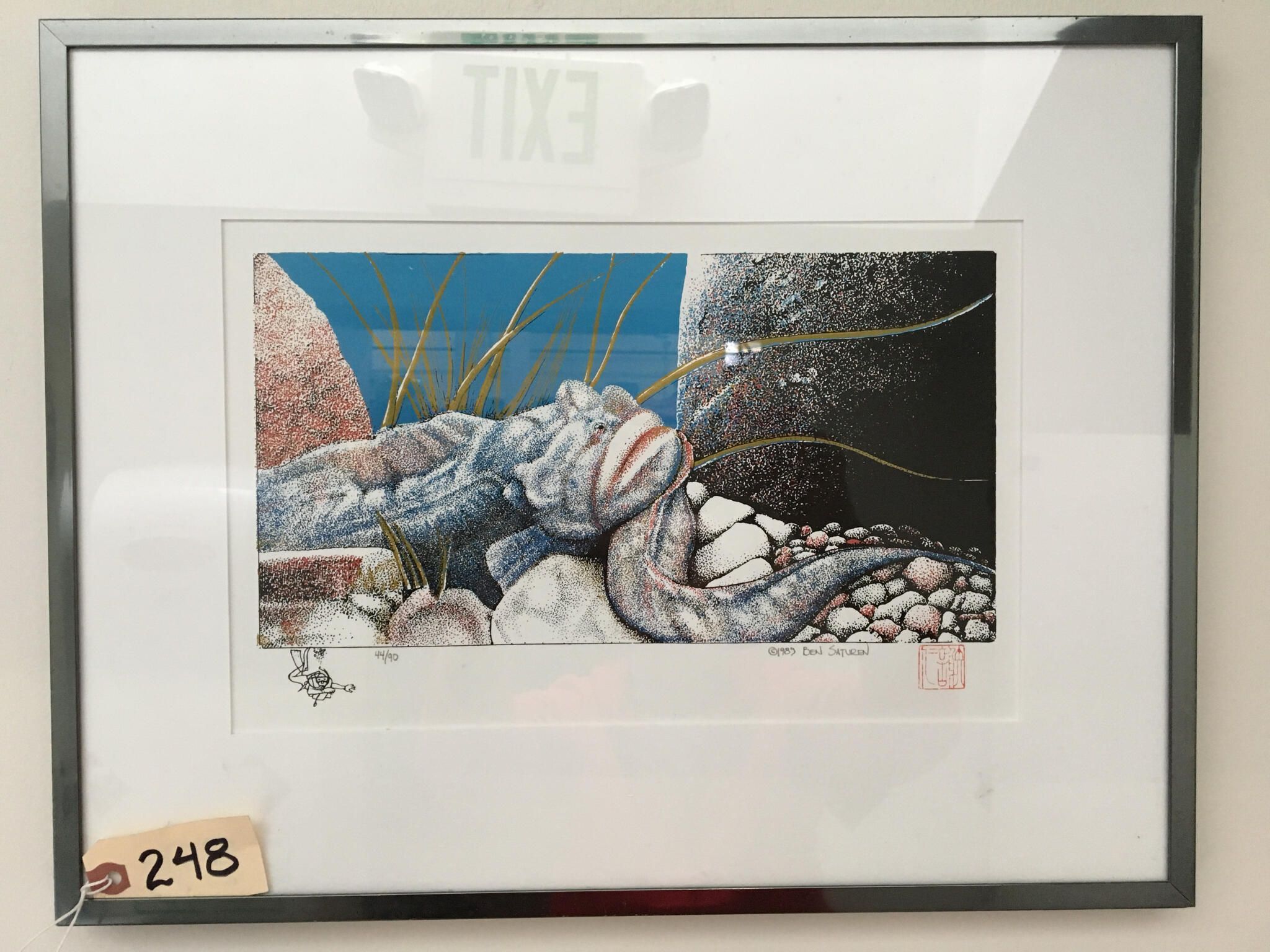 Framed print of image of eel with face; grass and rocks, blue, red and black. Small sketched deep sea diver lower left. On white mat dark metal frame.
