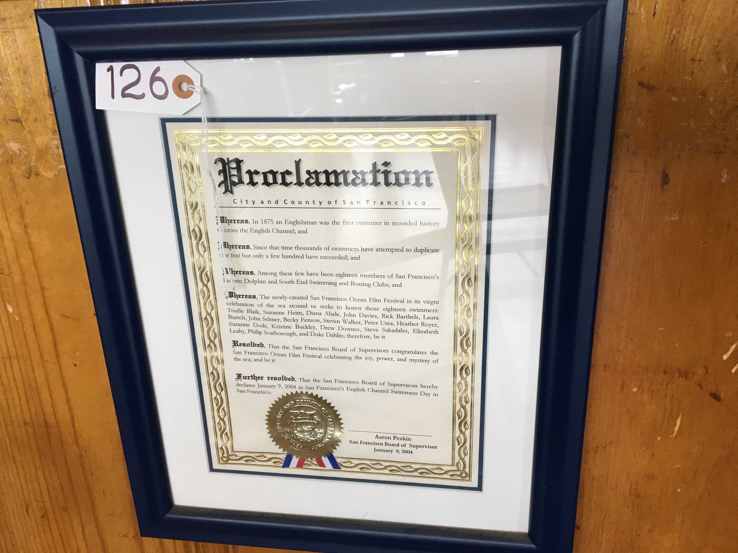 Blue frame with mounted gilded SF proclamation with city seal over tricolor ribbon. Congratulates first “SF Ocean Film Festival” and declares January 9, 2004 “San Francisco English Channel Swimmers Day” signed by Supervisor Aaron Peskin.Made/Created