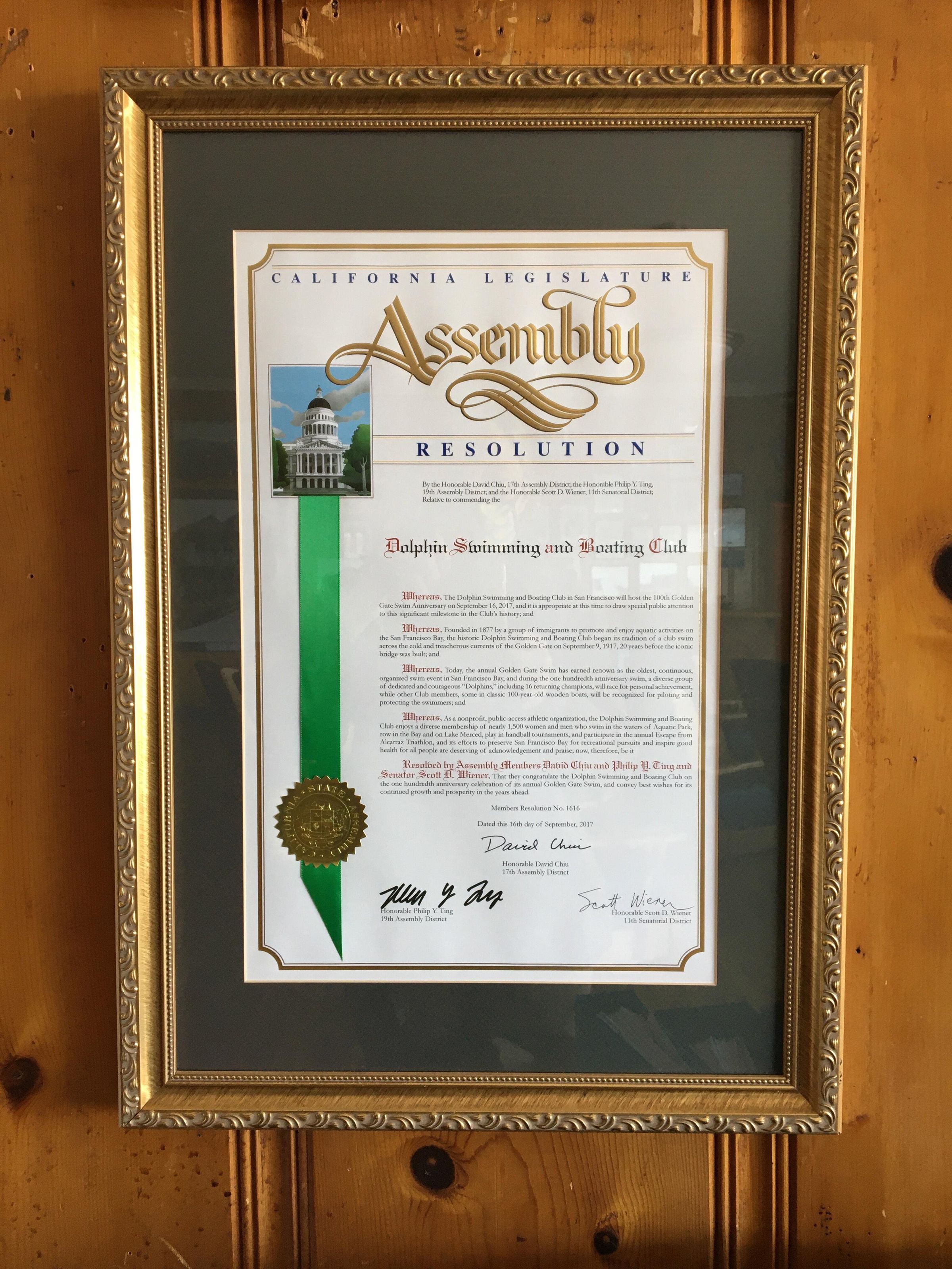 Framed Resolution for 100th Anniversary of GG Swim