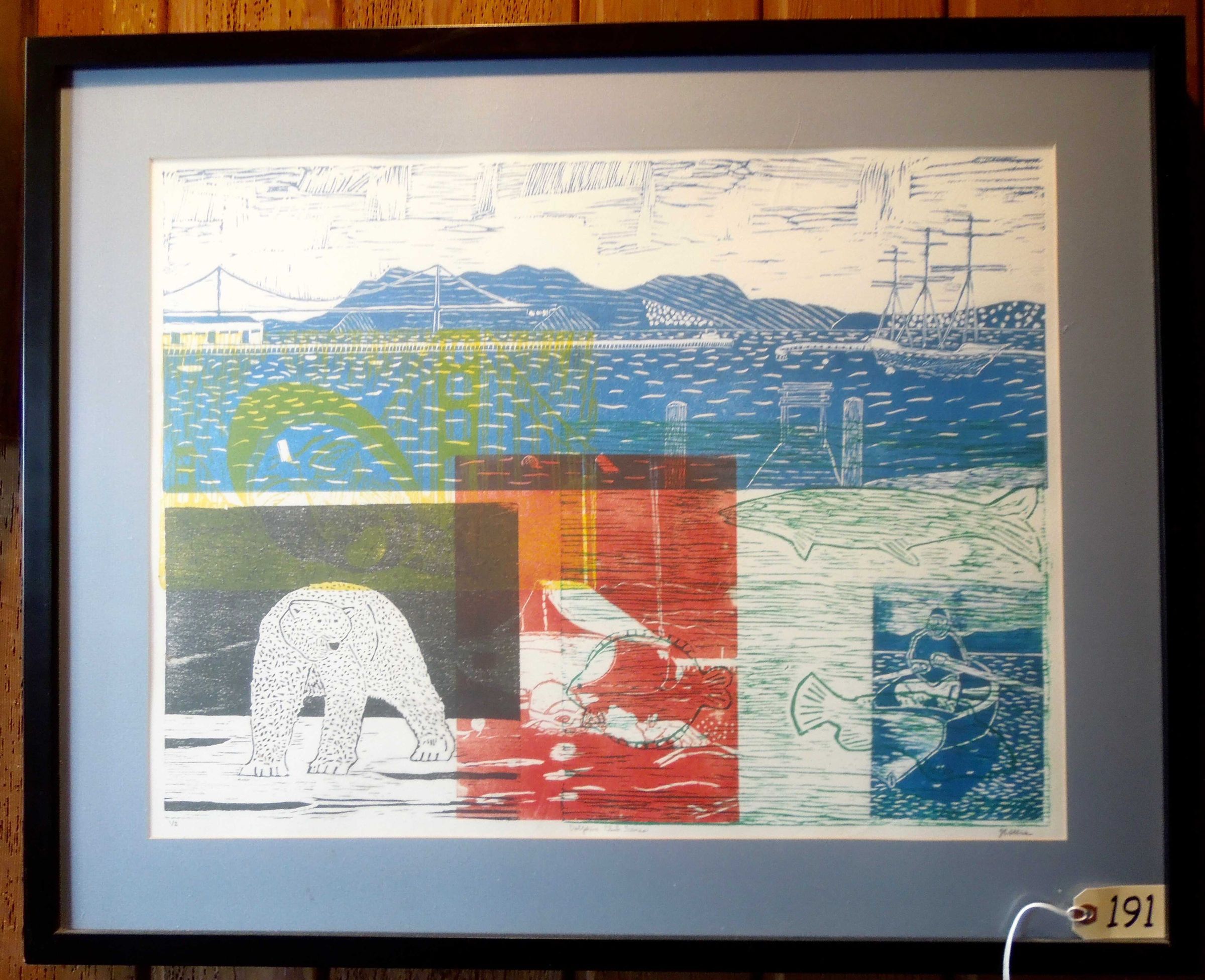 Wood block images of Golden Gate Bridge, Marin Headlands as seen from Dolphin Club and cove. Includes images of polar bear, swimmer, fish and rower in boat. Blue, Red, yellow, green, & black.