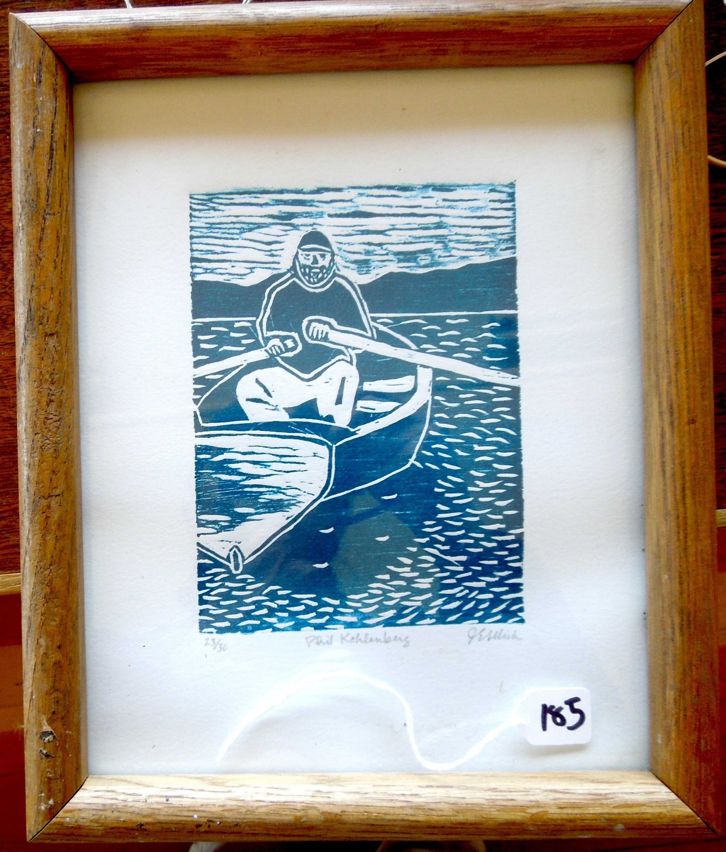 Blue ink woodcut print on white paper of rower in a wooden boat; brown wood frame with glass.