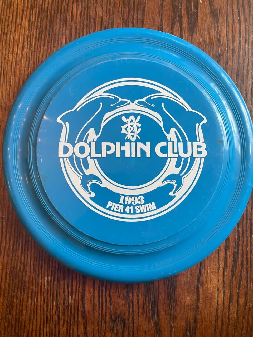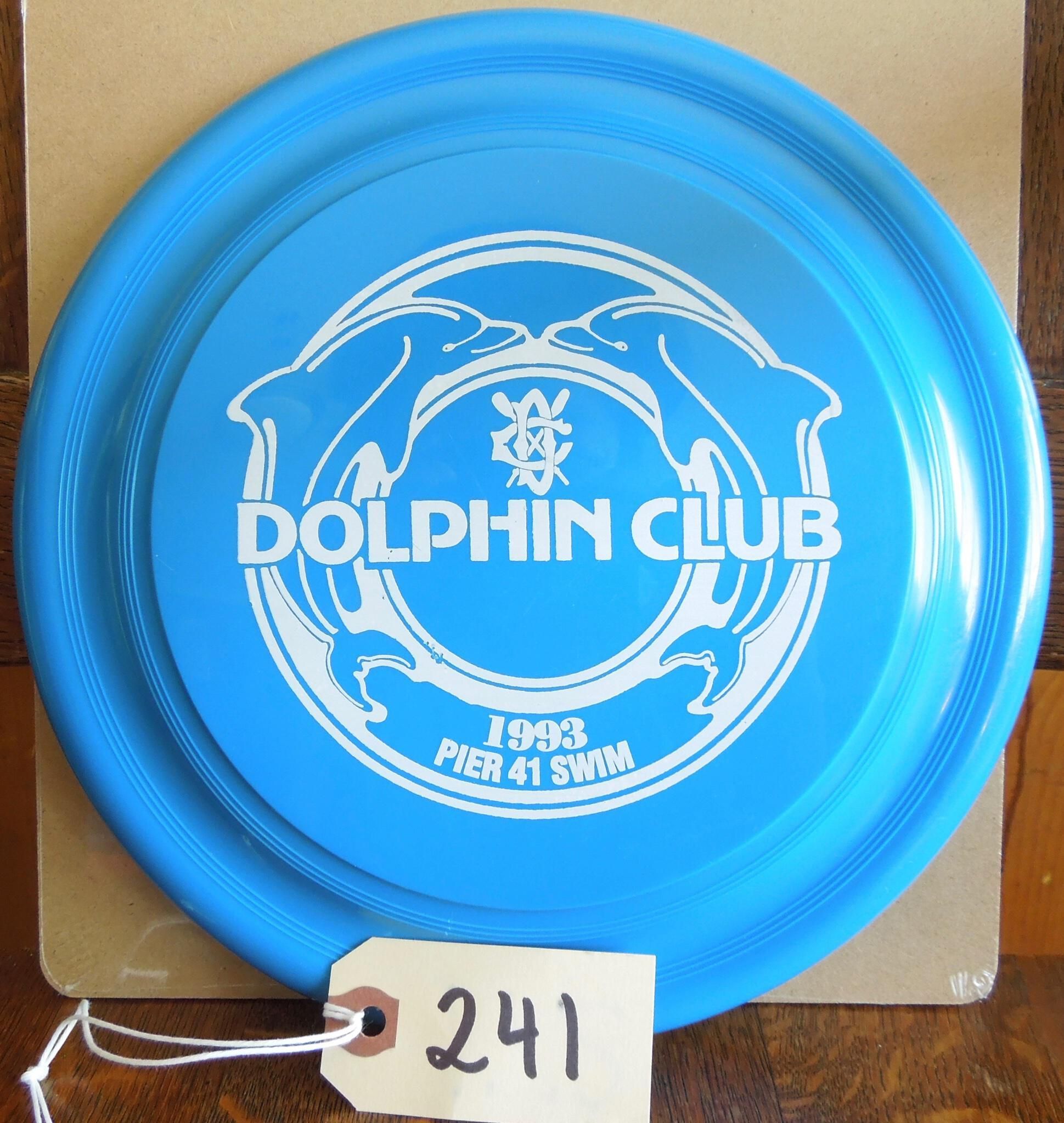 Design is circle with one dolphin in curve on either side, white Dolphin Club logo on top on inside circle, and capital letters "Dolphin Club" printed across center.