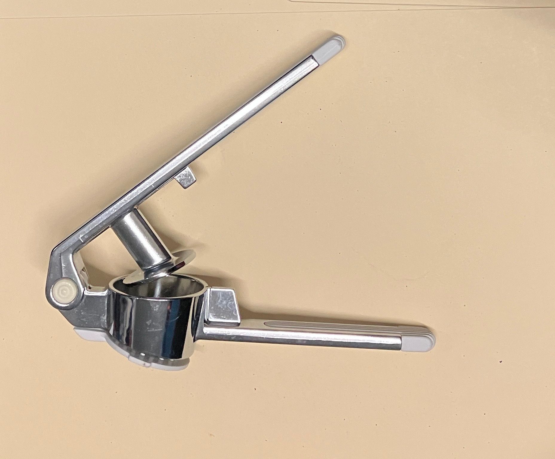 Metal hinged garlic press. White plastic disk on top and white plastic strips set into the handles. White plastic disk has points on inside to hold garlic clove in place.