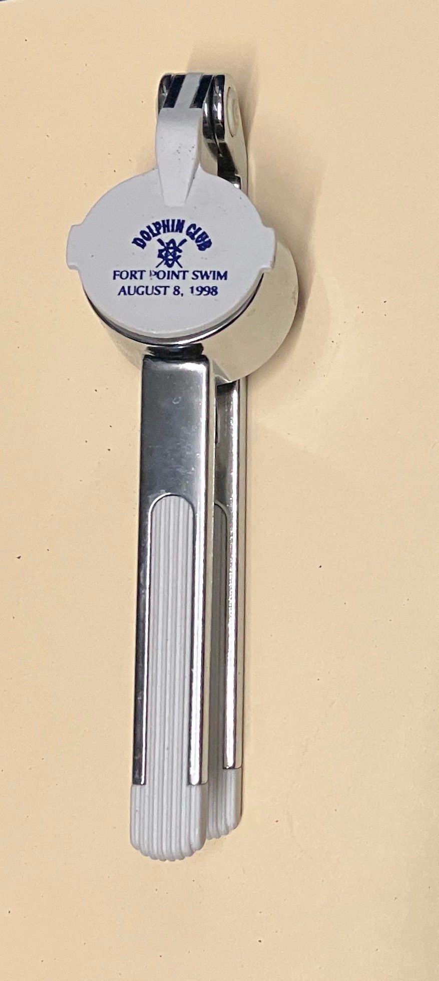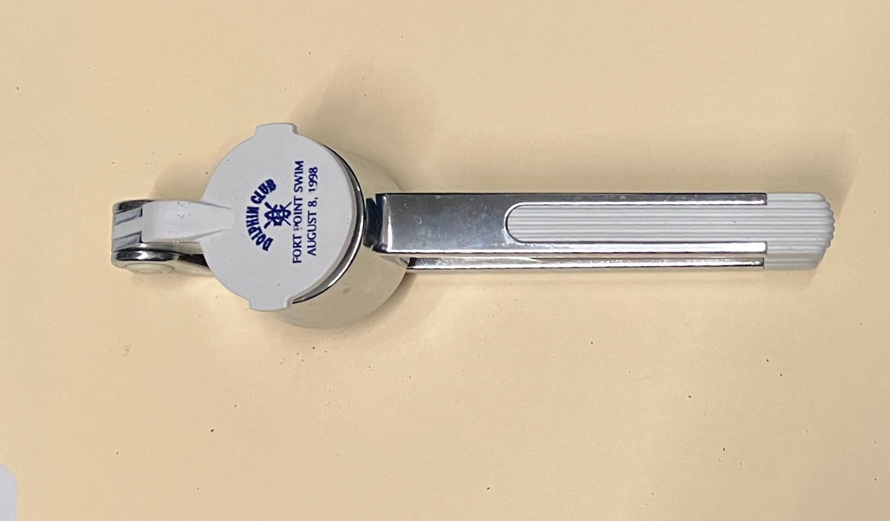 On white plastic disk in blue text: Dolphin Club - crossed oars logo - Fort Point Swim - August 8, 1988Use
