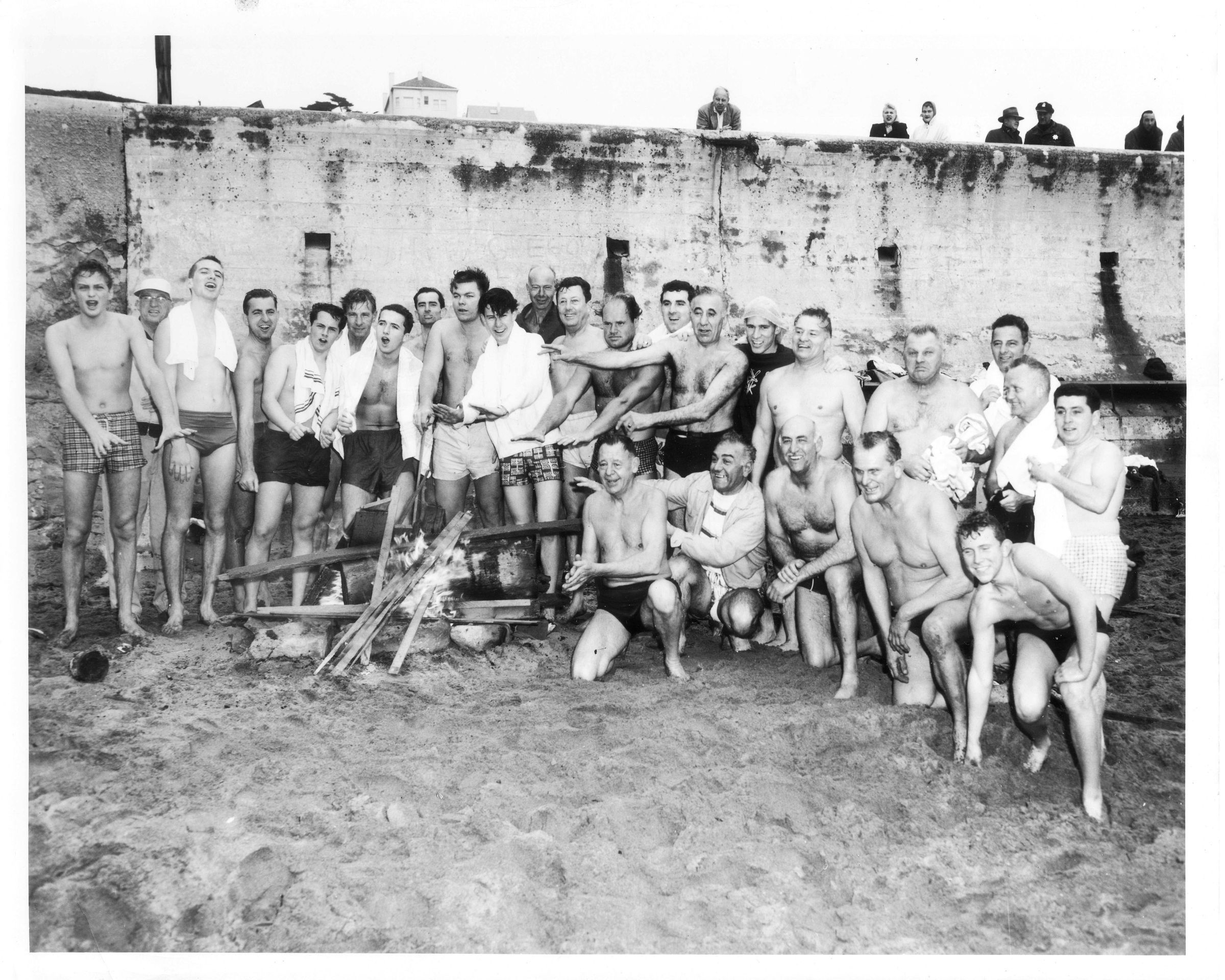 Swimmers around a fire on Ocean Beach