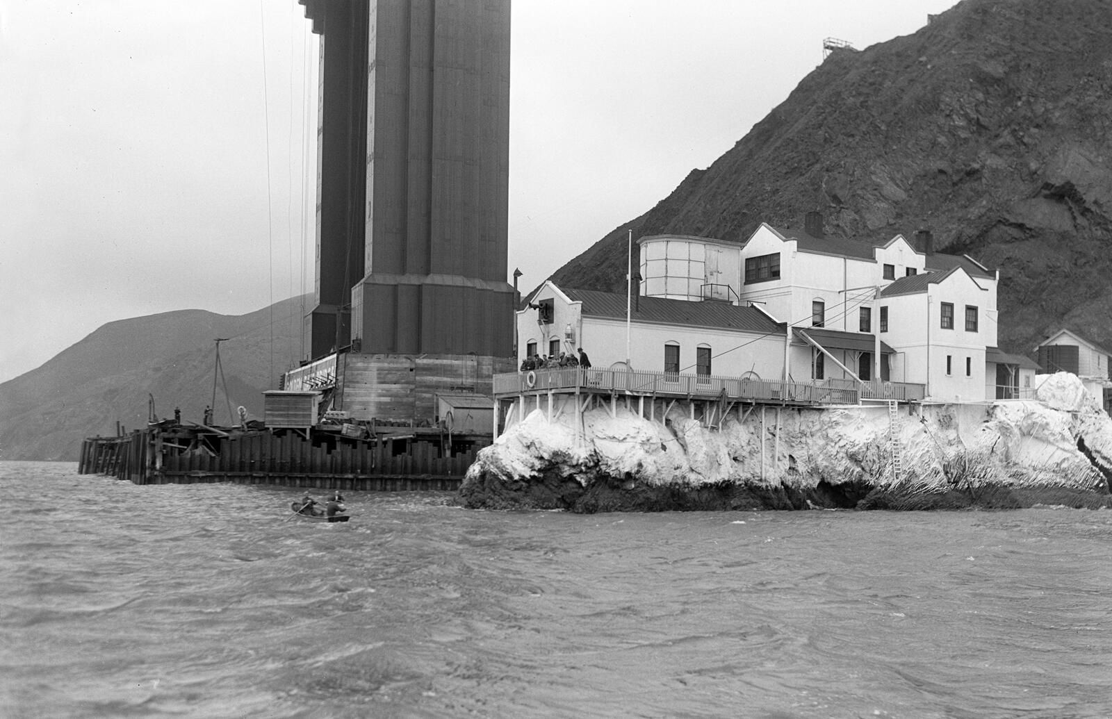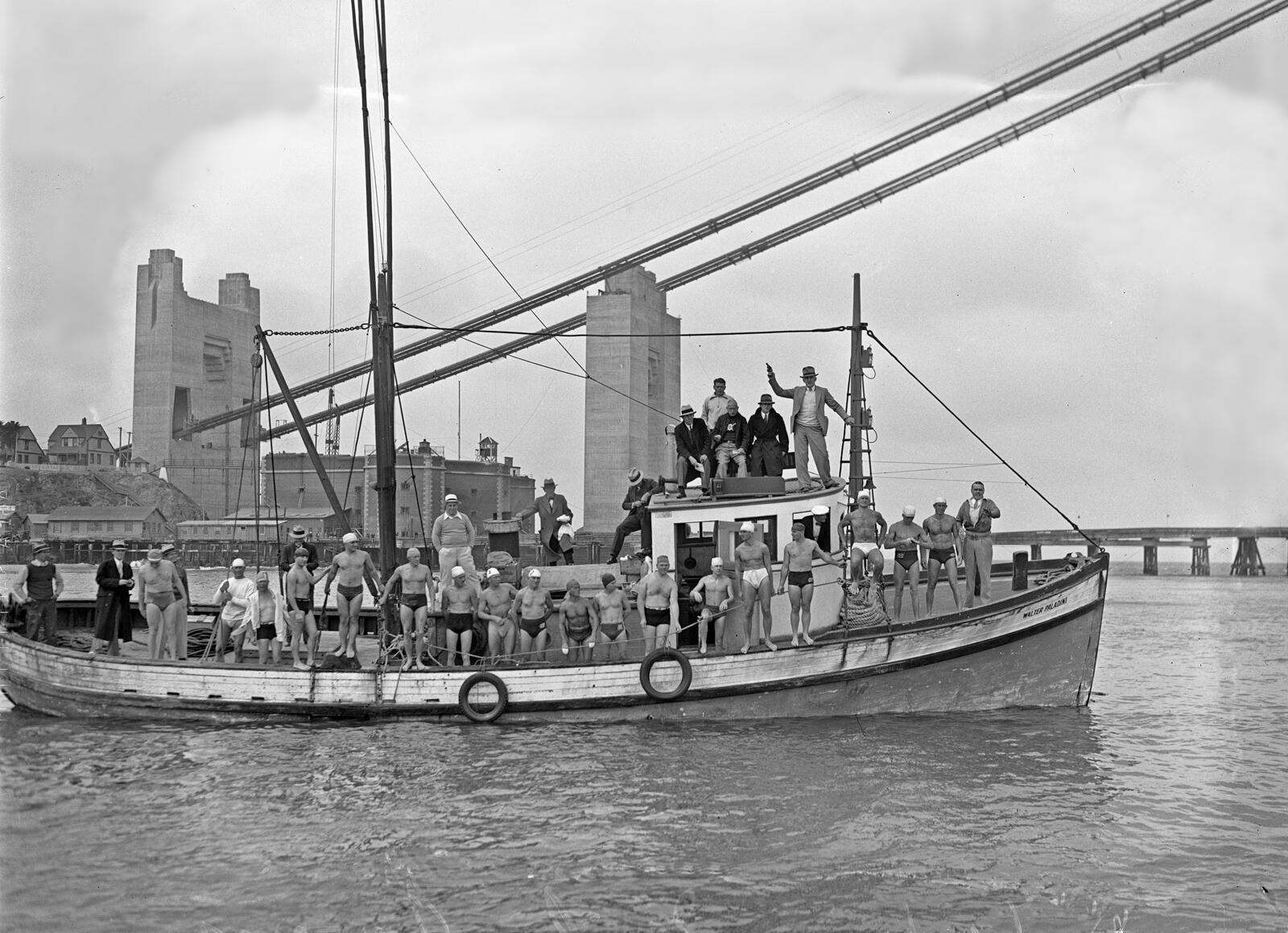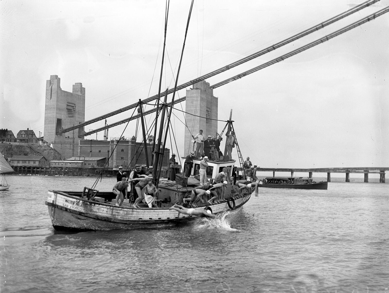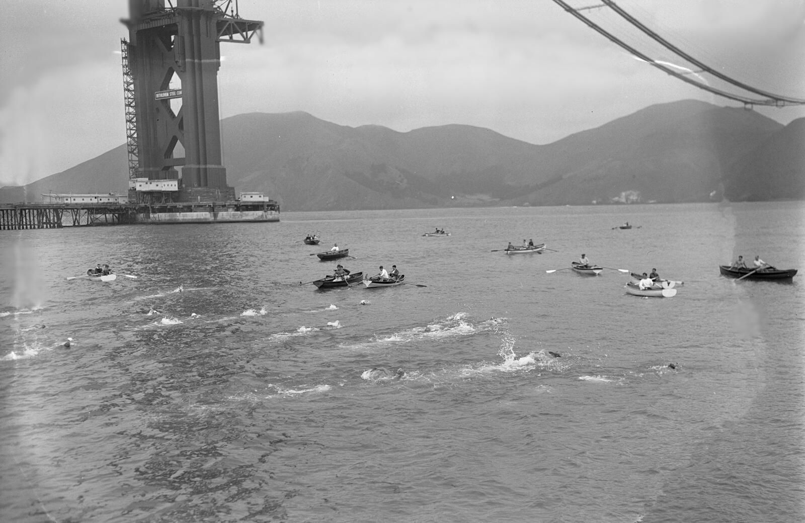 The Dolphin Club swim in 1936 with the Golden Gate Bridge being built