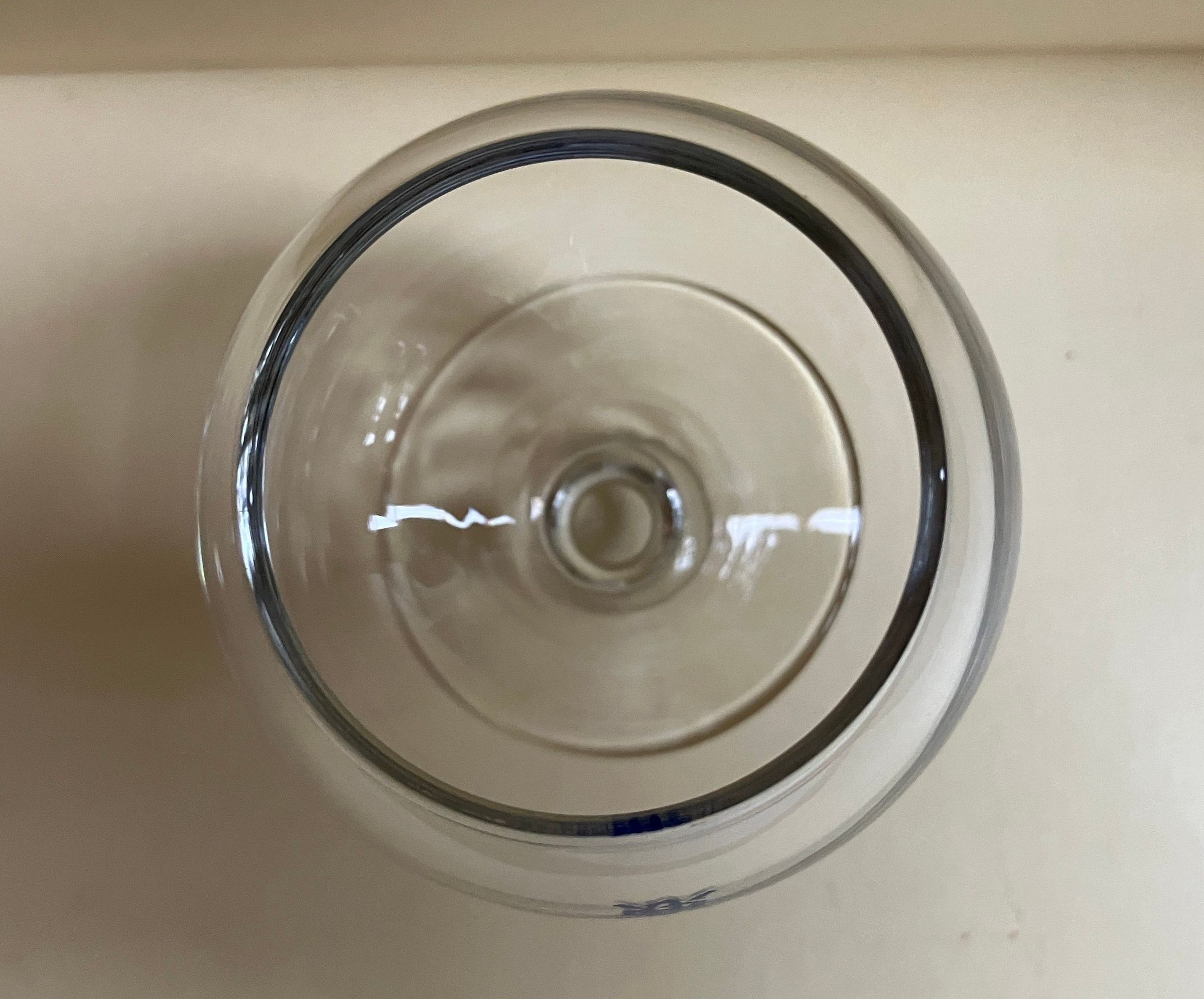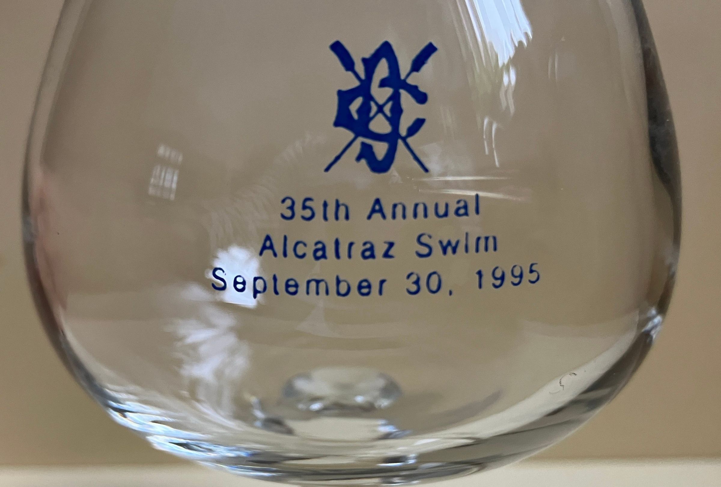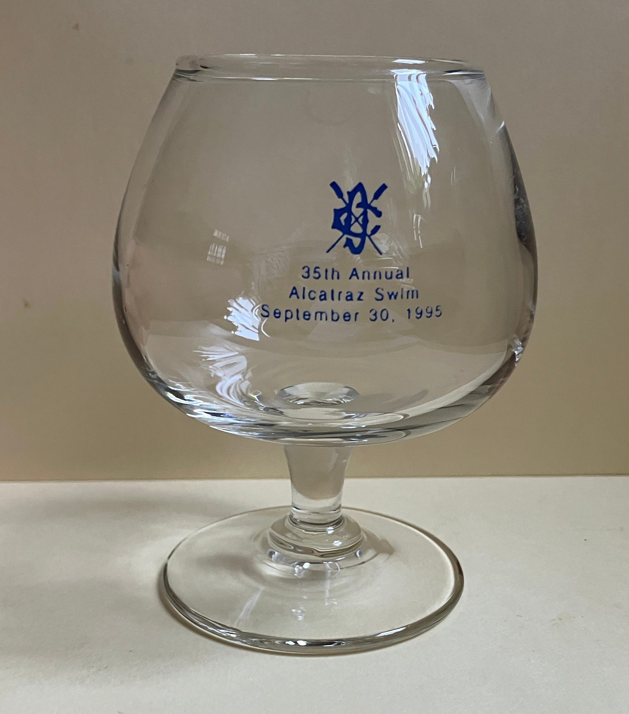 Small brandy snifter style glass. Text in blue on one side: Crossed oars logo - 35th Annual - Alcatraz Swim - September 30, 1995