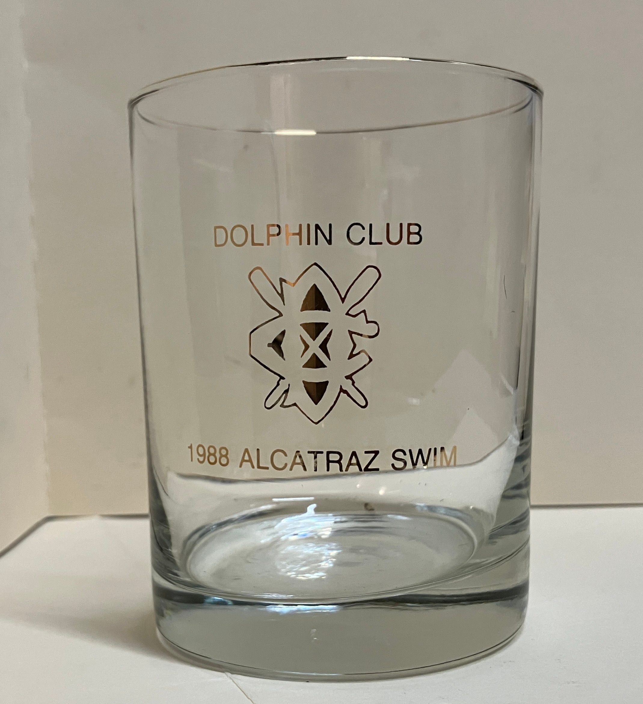 Gold printing on the side: "Dolphin Club - outline of crossed oars logo with interspaces filled in - 1988 Alcatraz Swim"Use