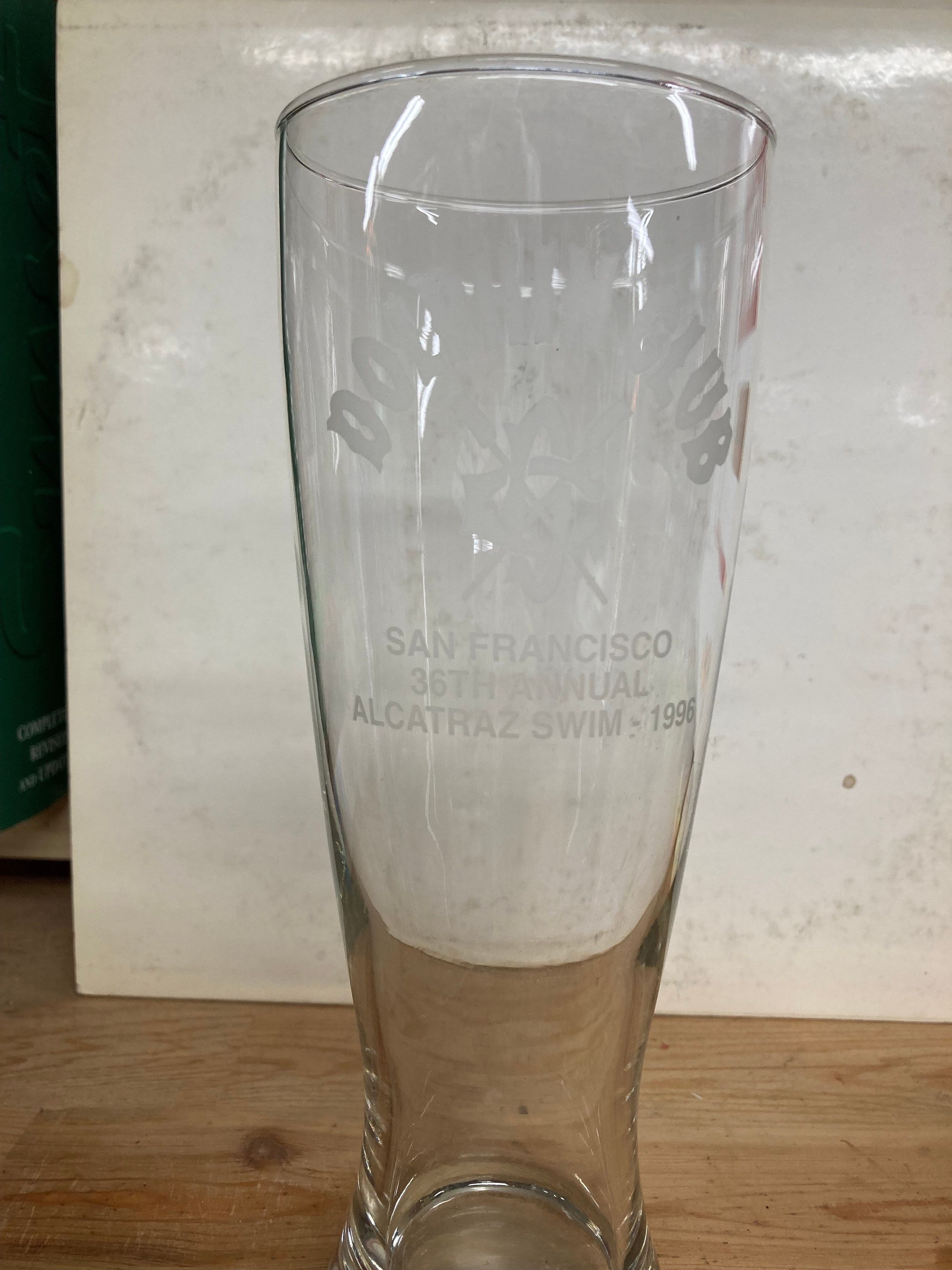 Pilsner type beer glass tall with tapered base with with engraved white text.